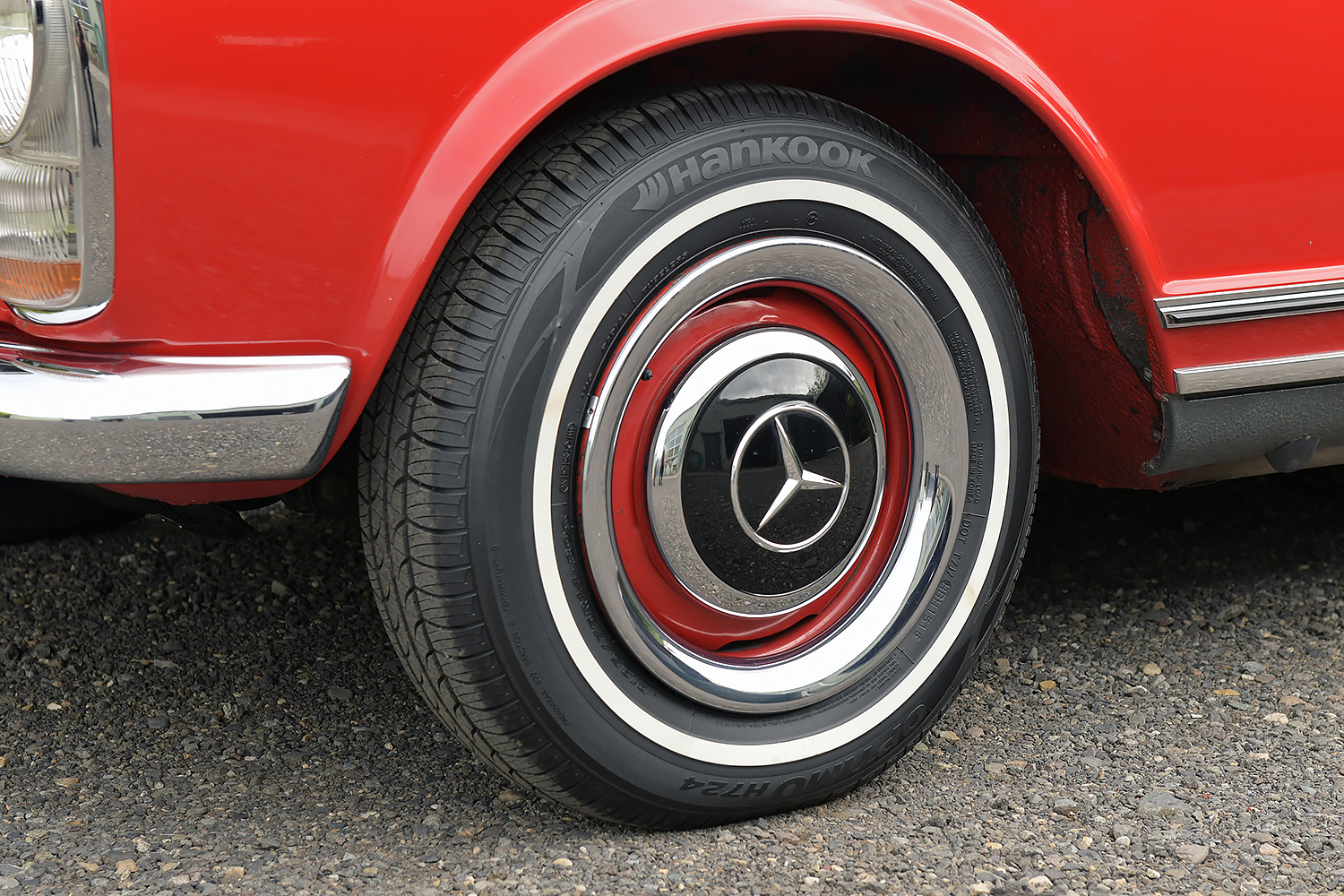 The hubcaps were color matched to the hardtop on two-tone SLs, and this example retains black-painted covers and chrome trim rings fitted to the factory 14″ steel wheels. Size 185/75 Hankook whitewall tires display 2015 date codes. A spare wheel with Firestone Phoenix rubber is housed in the trunk along with the factory jack and tool kit.