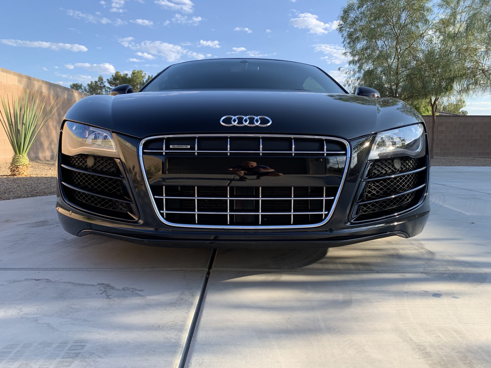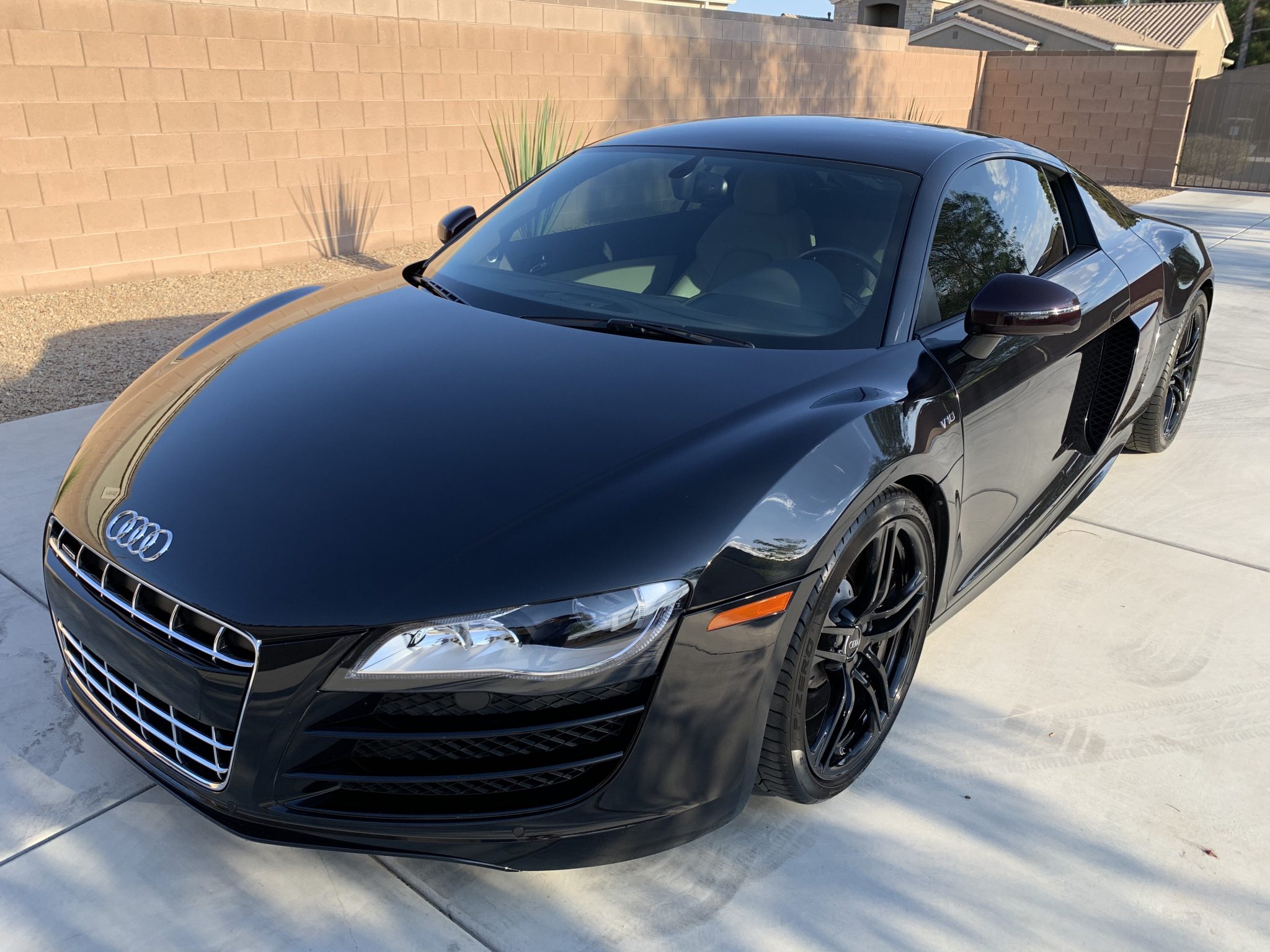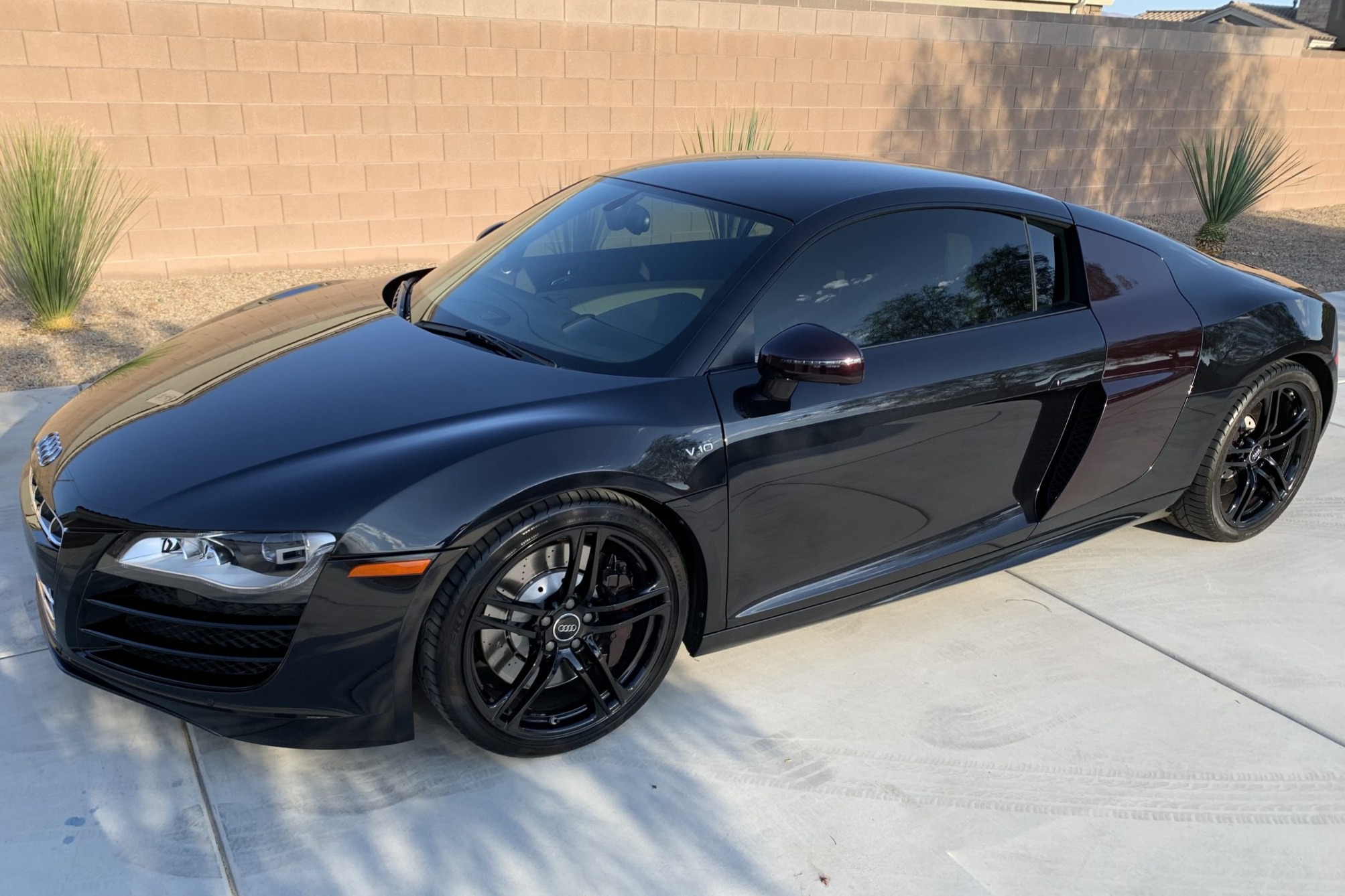 Factory 19″ twin-spoke wheels have been powder-coated black and are wrapped in Pirelli P Zero tires. The seller notes that three of the adaptive magnetic-ride shocks have been replaced. Braking is from “Black Cherry” R8-branded calipers and cross-drilled rotors all around.