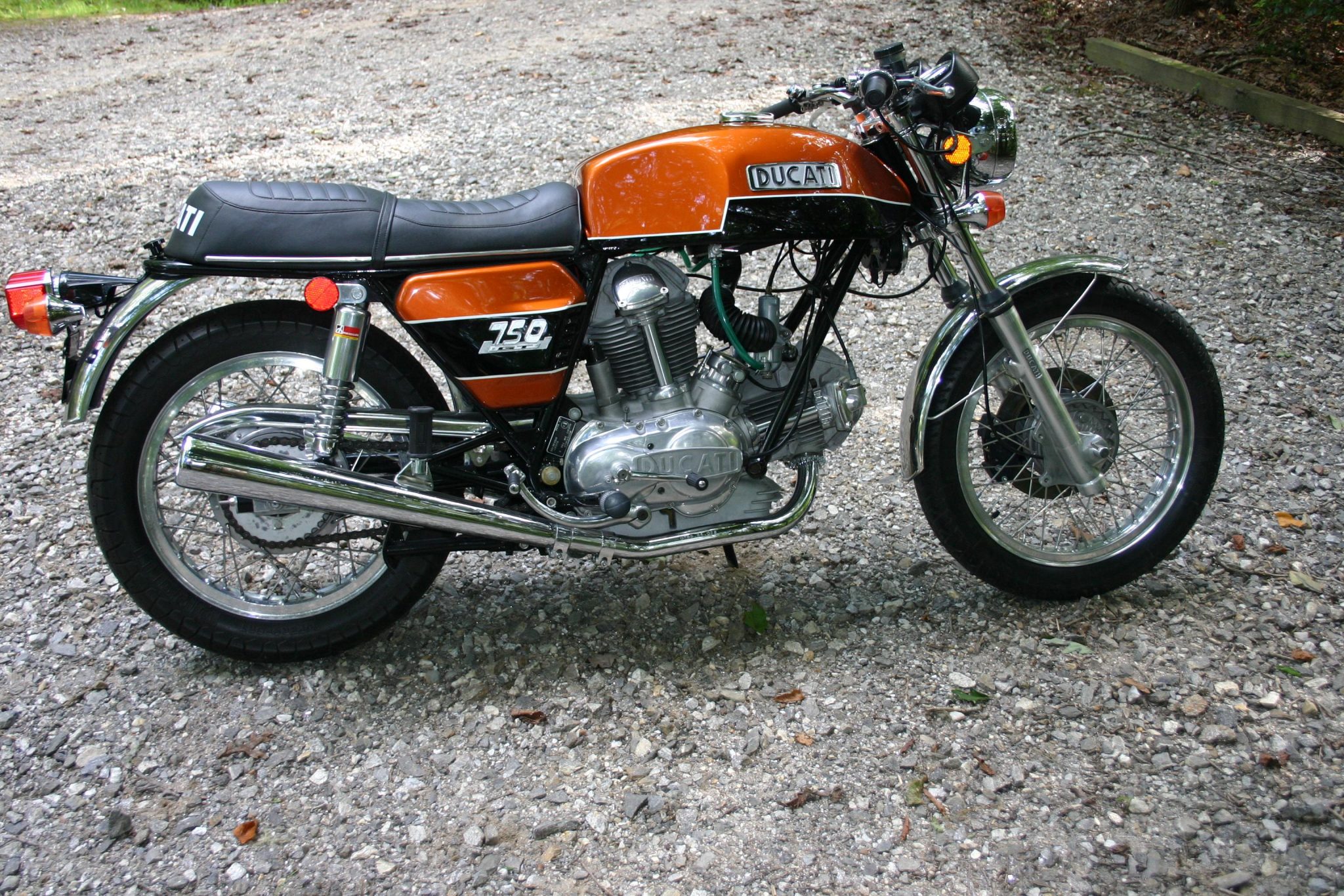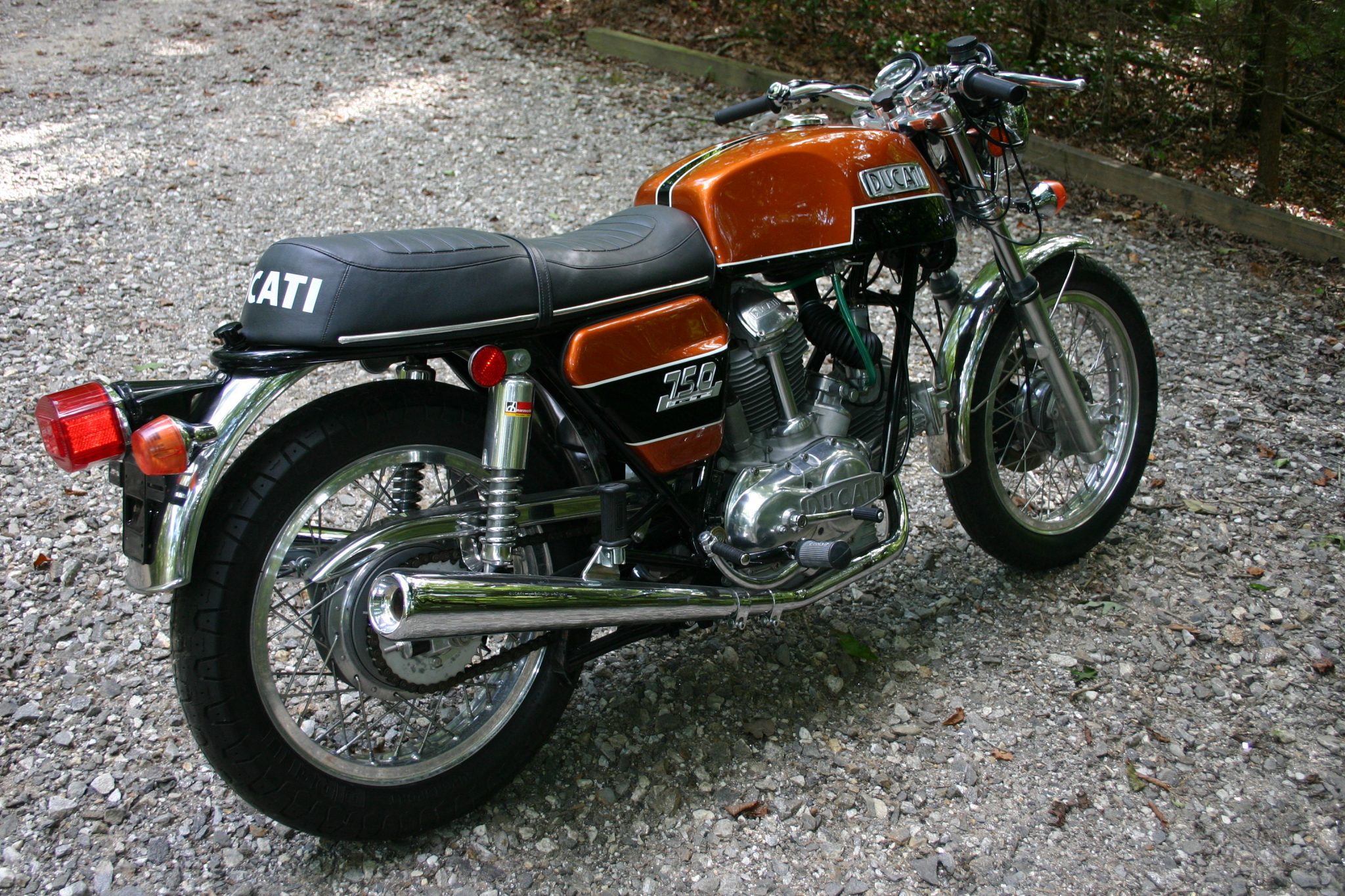 Borrani wire-spoke wheels feature shouldered aluminum rims, replacement spokes, and older tires that the seller recommends replacing due to age. The Marzocchi conventional fork was rebuilt by Bevel Heaven of Concord, California in 2008 using dual-rate springs along with new wipers, seals and O-rings. Suspension also includes a rear swingarm mounted with dual chrome shocks. Braking is from a single updated Brembo disc up front and a drum in the rear.