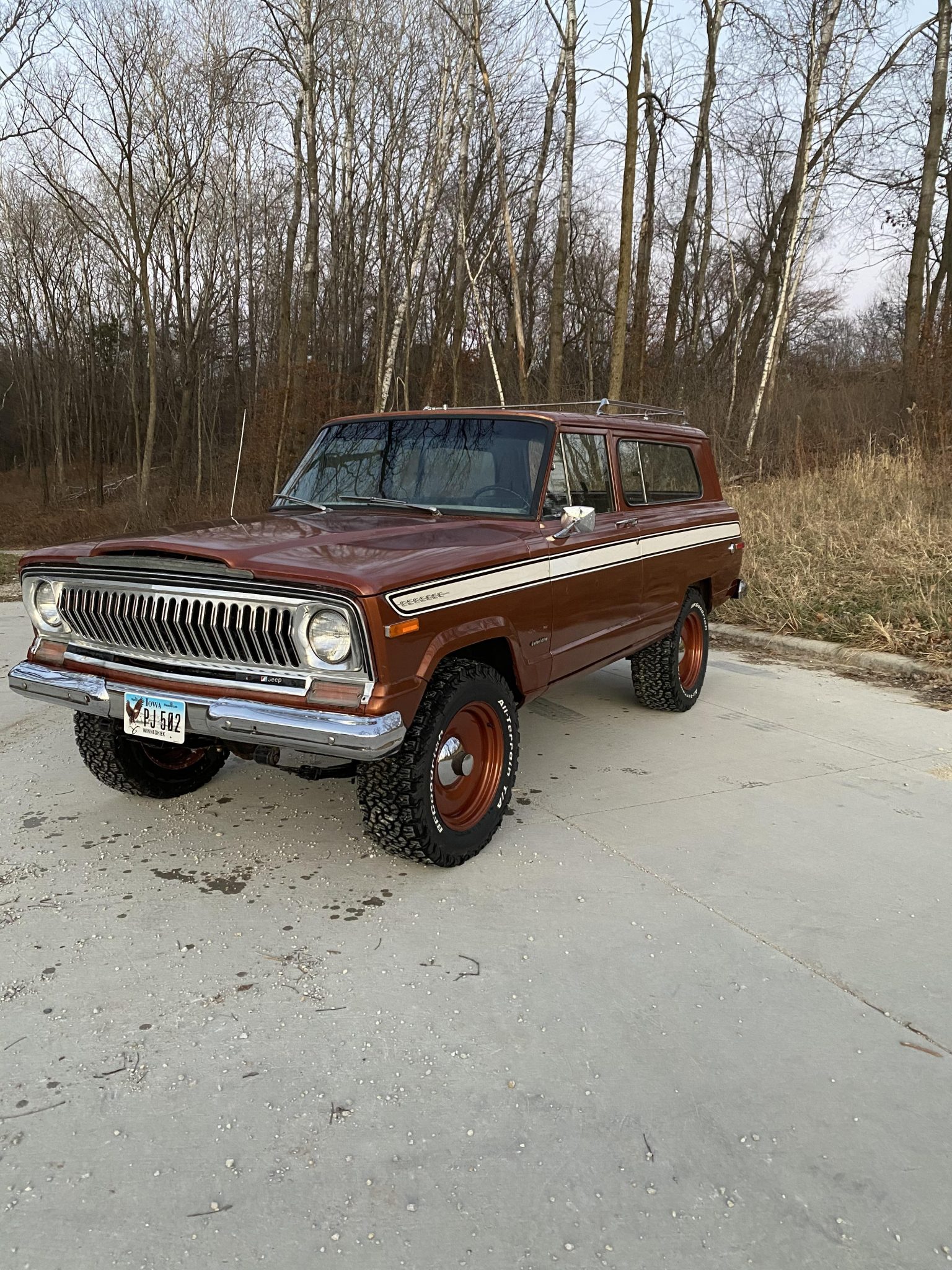 Replacement 18″ Detroit Steel Wheels are finished in the body-color and wear BFGoodrich All-Terrain T/A tires that were recently installed according to the seller. The truck has been lifted and features power-assisted brakes. Spare steel wheels are included in the sale and can be viewed below.