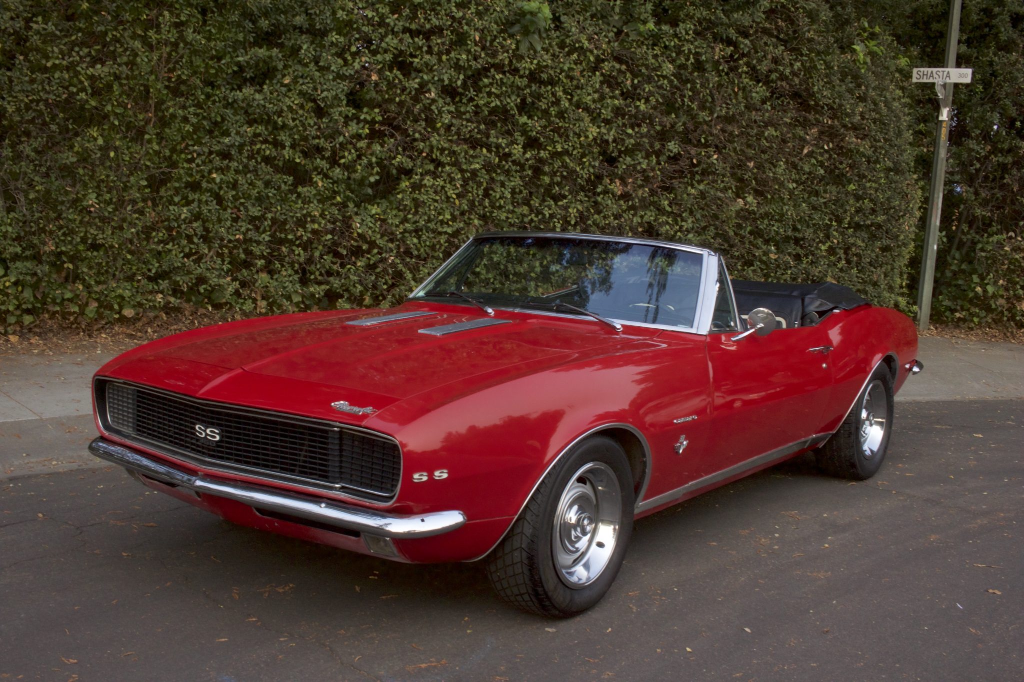 Silver-finished 15″ Rallye wheels wear chrome trim rings with center caps and are mounted with Goodyear and Yokohama tires. The ride height has reportedly been lowered with the use of lowering blocks, a front sway bar added, and the factory mono-leaf springs were replaced with multi-leaf versions used on the 1968 Camaro; the removed factory parts will accompany the car. The power-operated soft top is shown raised and lowered in the image gallery below, and a video demonstrating its operation is linked here.