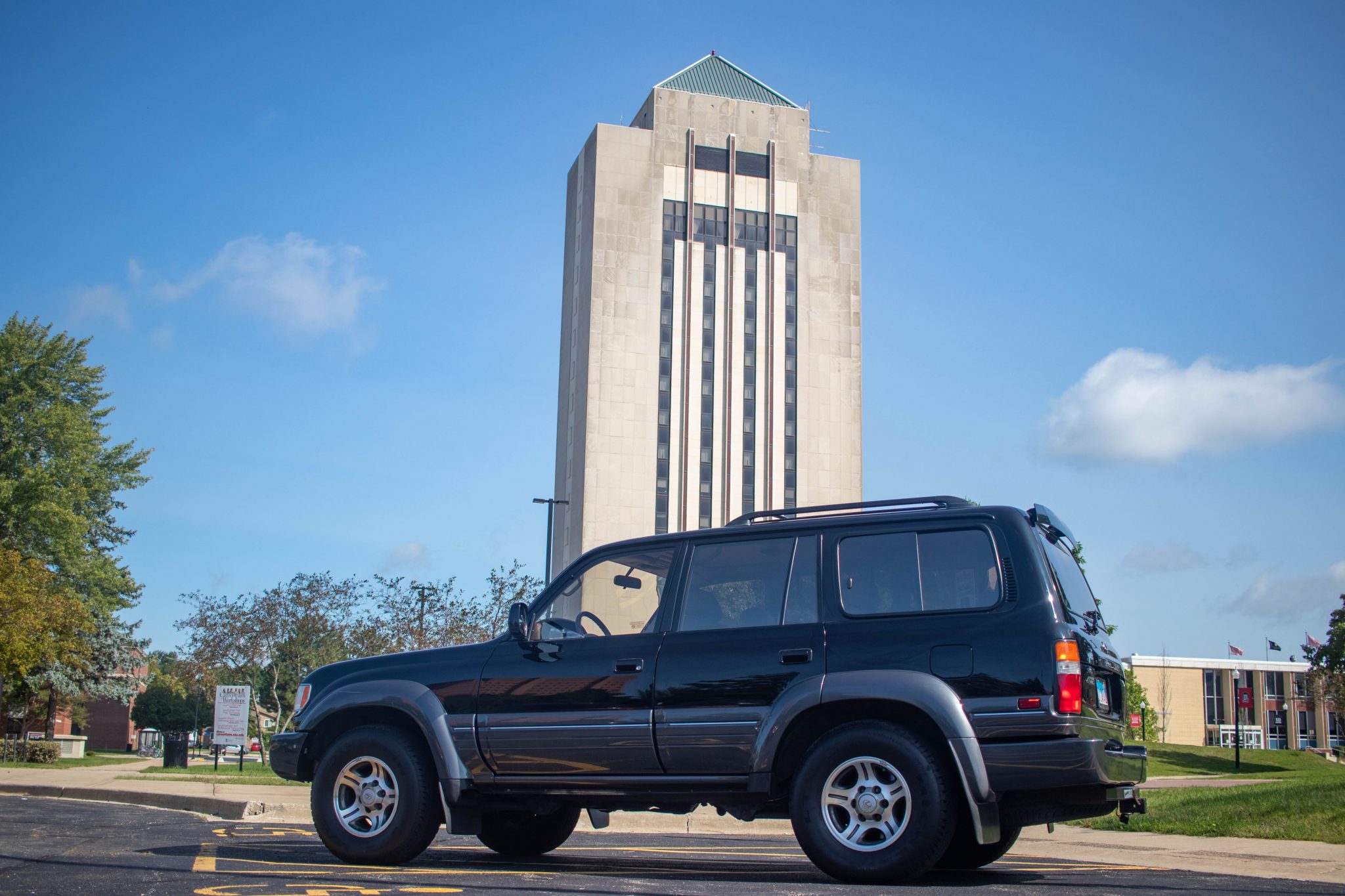 Factory 16″ alloy wheels are mounted with 275/70 Michelin LTX M/S tires at each corner, and a spare wheel and tire are mounted underneath the truck.