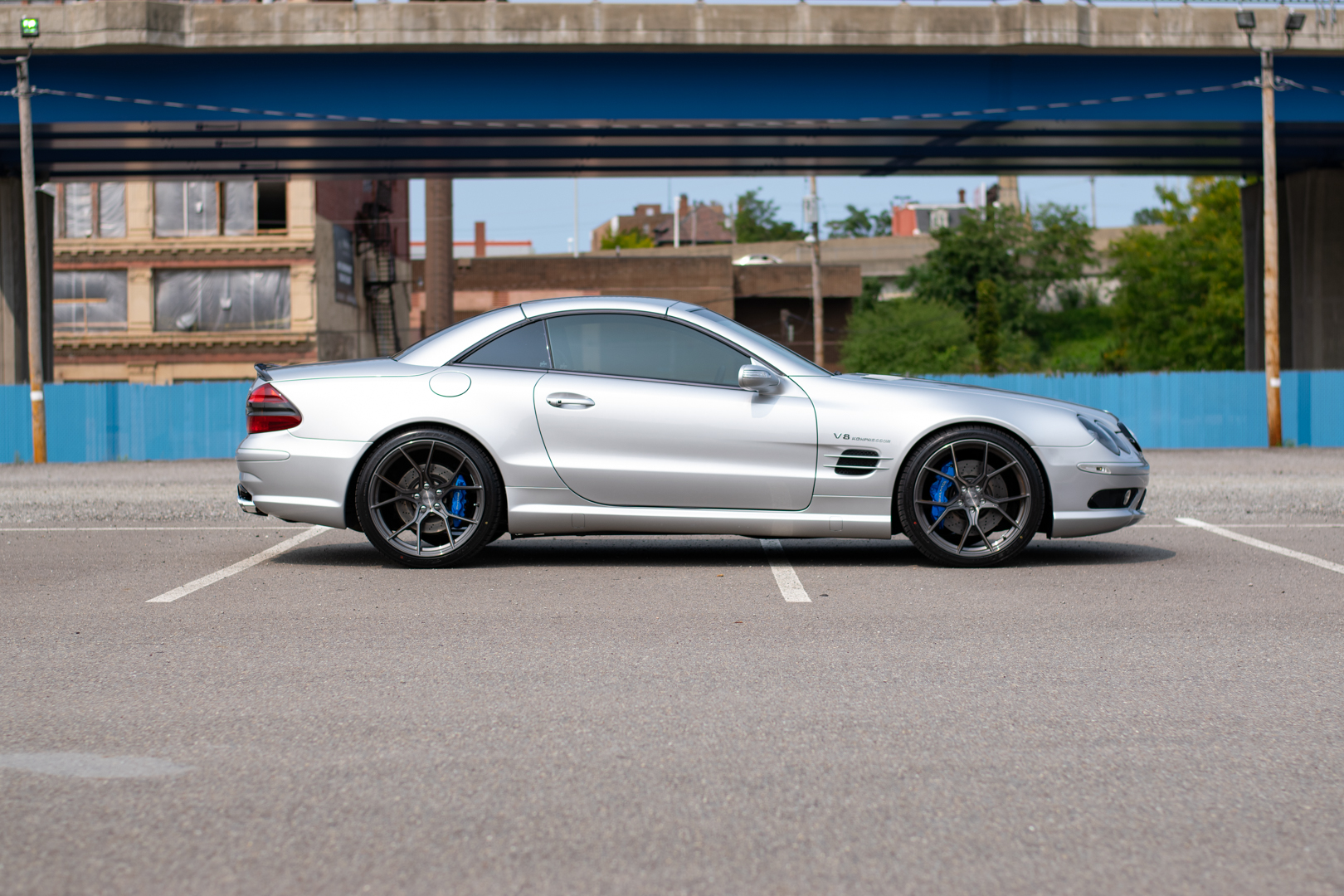 Gunmetal 20″ Stance wheels wear 255/35 front and 295/30 rear Falken Azenis FK510 tires showing 2019 and 2020 date codes. The brake calipers have been powder-coated blue, and recent service is said to include a brake fluid flush, an alignment, and replacement of the following components: