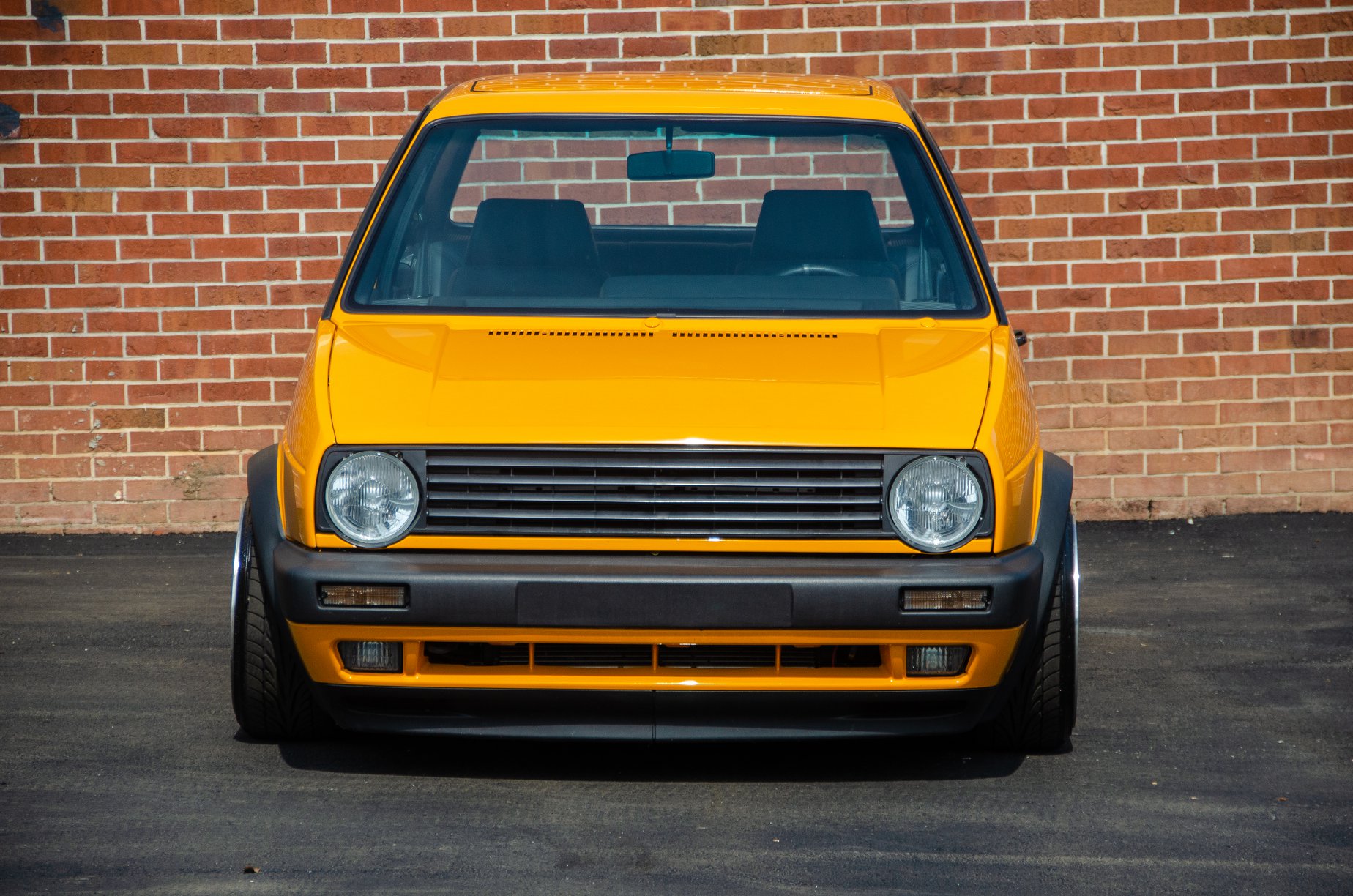 Staggered-width 16″ chrome wheels wear 195/40 and 215/35 Dunlop SP9000 tires. The five-lug axle hubs and suspension were sourced from a Volkswagon Corrado, and Weitec coilovers are fitted along with a manual steering rack and tie rod ends from a Mk3 Golf. The front and rear brakes are from a Mk4 Golf, and the selling dealer notes that stainless steel brake lines have been installed.