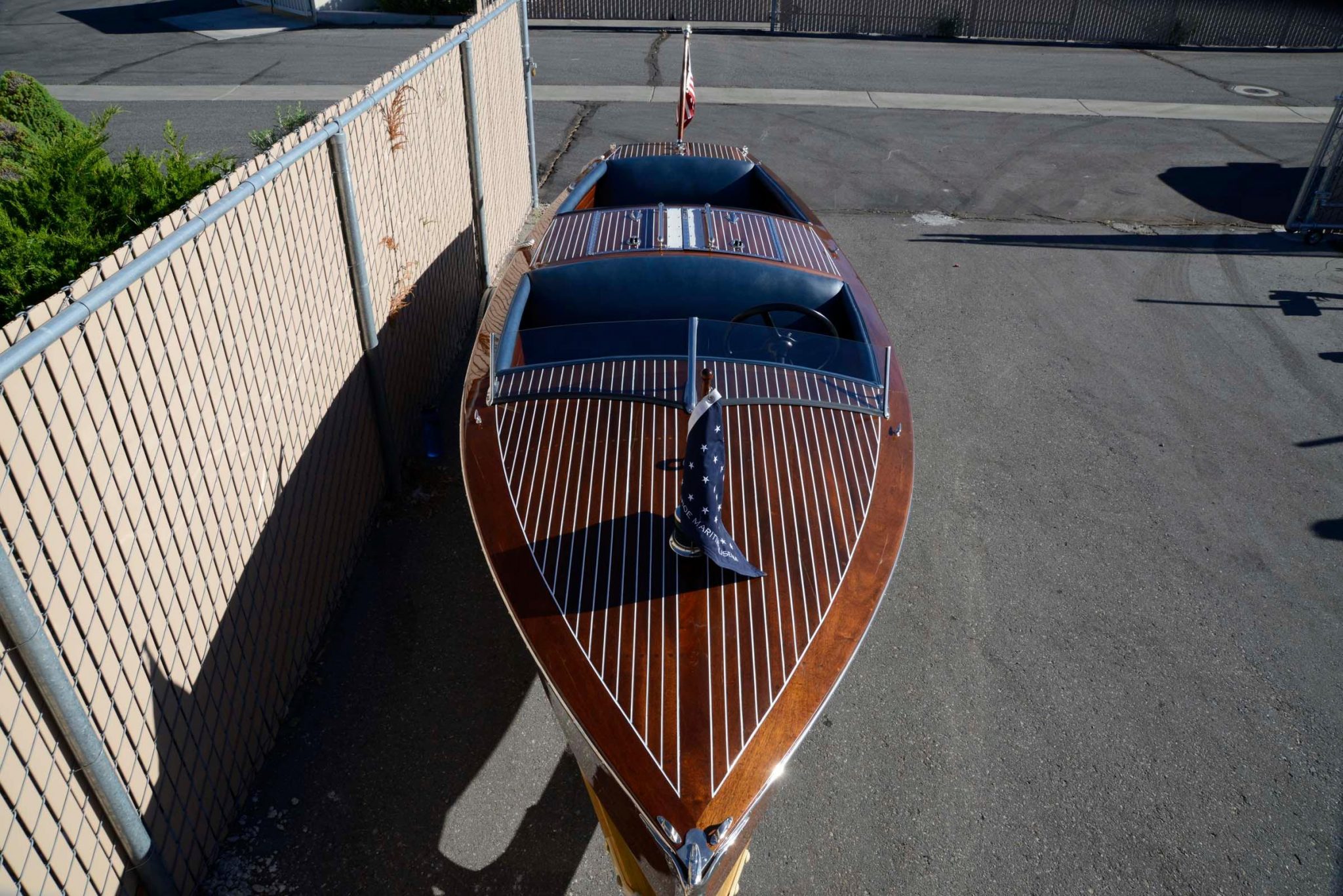The two cockpits are separated by the engine compartment, which features two hinged, mahogany-planked covers equipped with intake and exhaust cowls. The boat’s name, Miss Tessa, is painted in gold across the stern, and the exhaust exits out the port side of the transom through a polished flange.