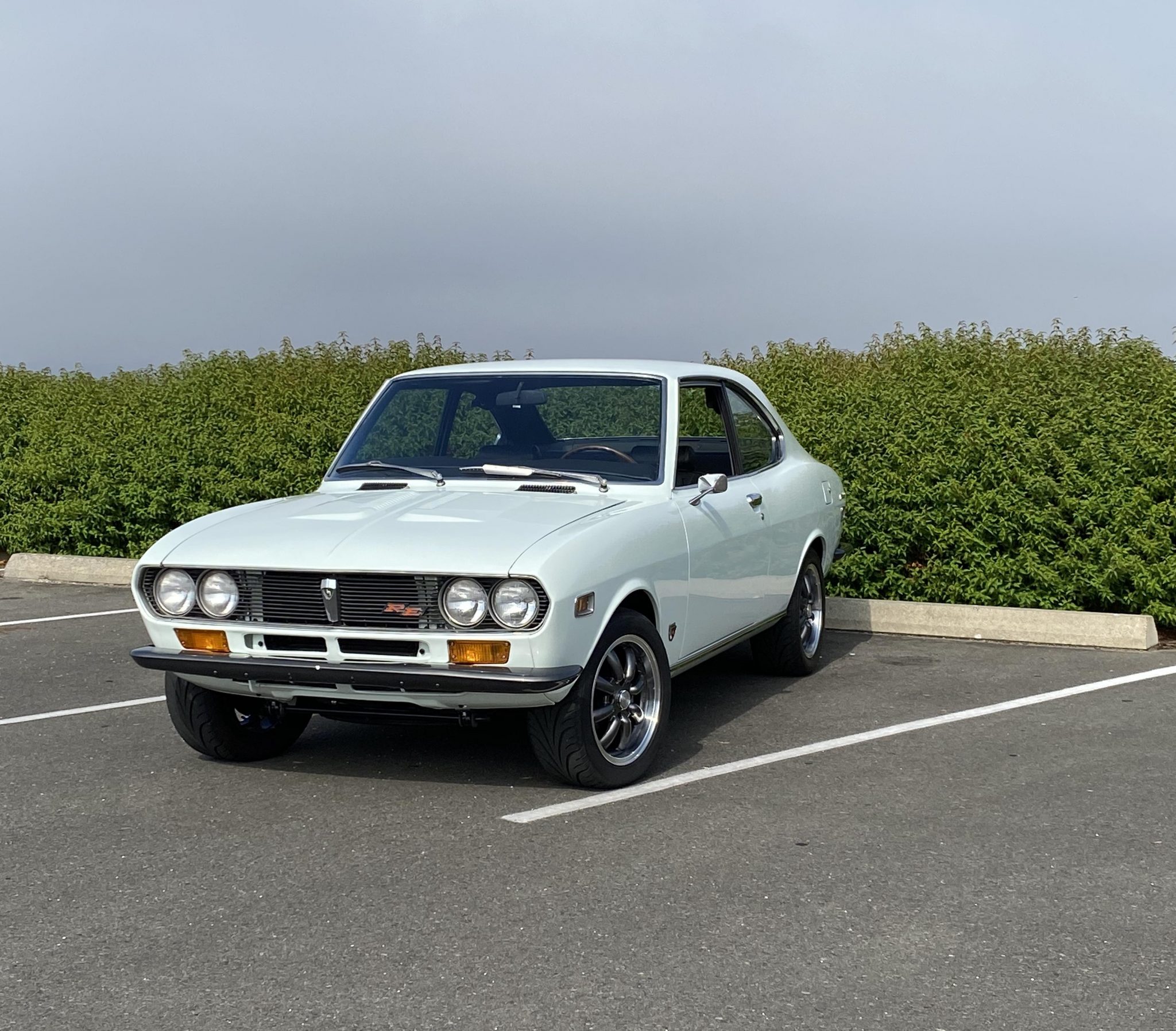 Konig Rewind 15” wheels feature gray centers with polished lips and are wrapped in Federal RS-R tires sized 205/50. The seller notes that the wheel cylinders and brake calipers were rebuilt, and MOOG bushings and ball joints were installed up front. The sway bar, center link, tie rods, and control arms are noted to have been powdercoated black.