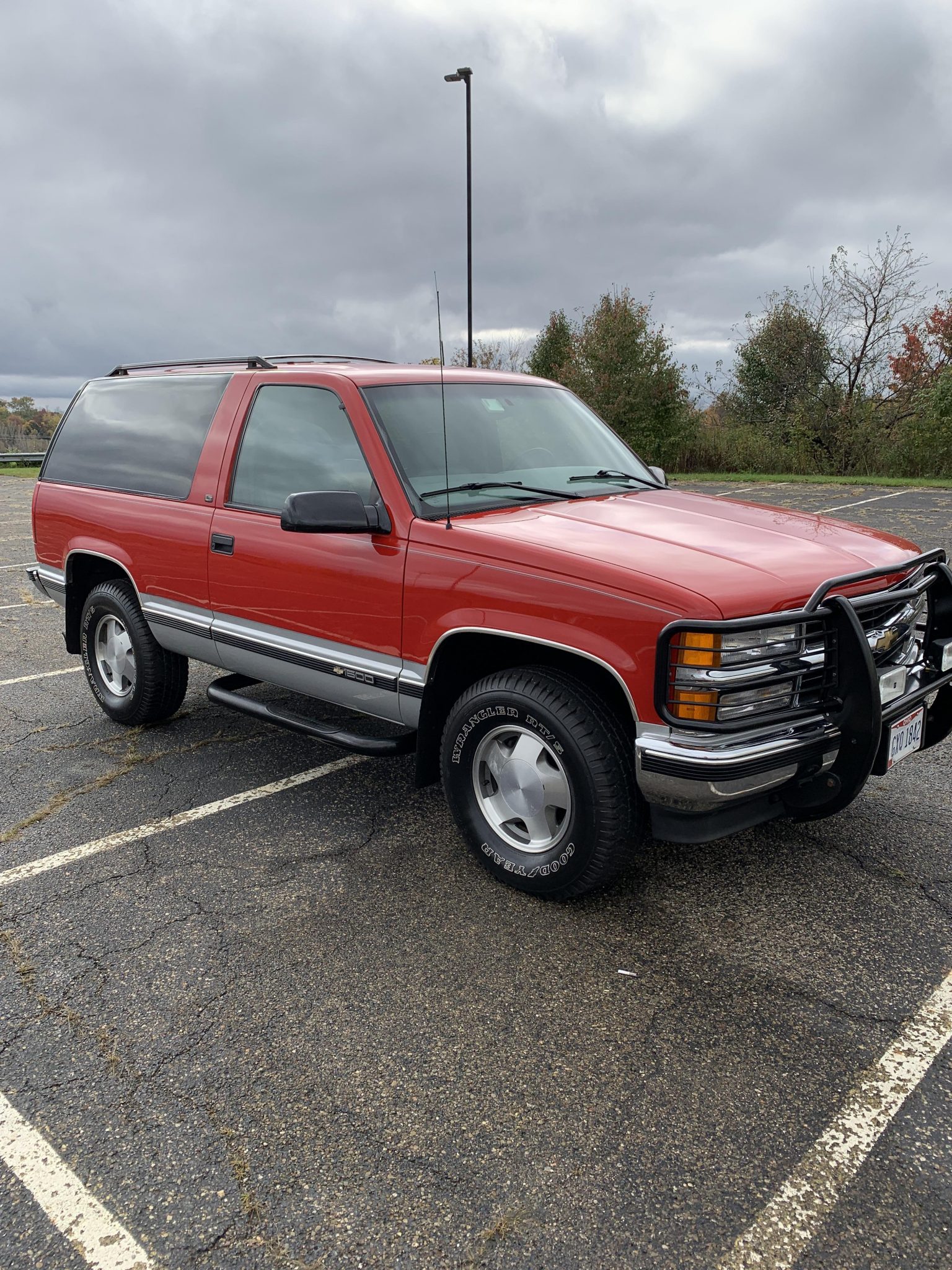 Factory 16″ wheels wear 265/75 Goodyear Wrangler RT/S tires. A spare protected by a carpeted cover is located in the cargo area and is accompanied by GM work gloves. Work performed in September 2016 included replacement of the front brake pads and rotors along with a cleaning and adjustment of the rear drums.