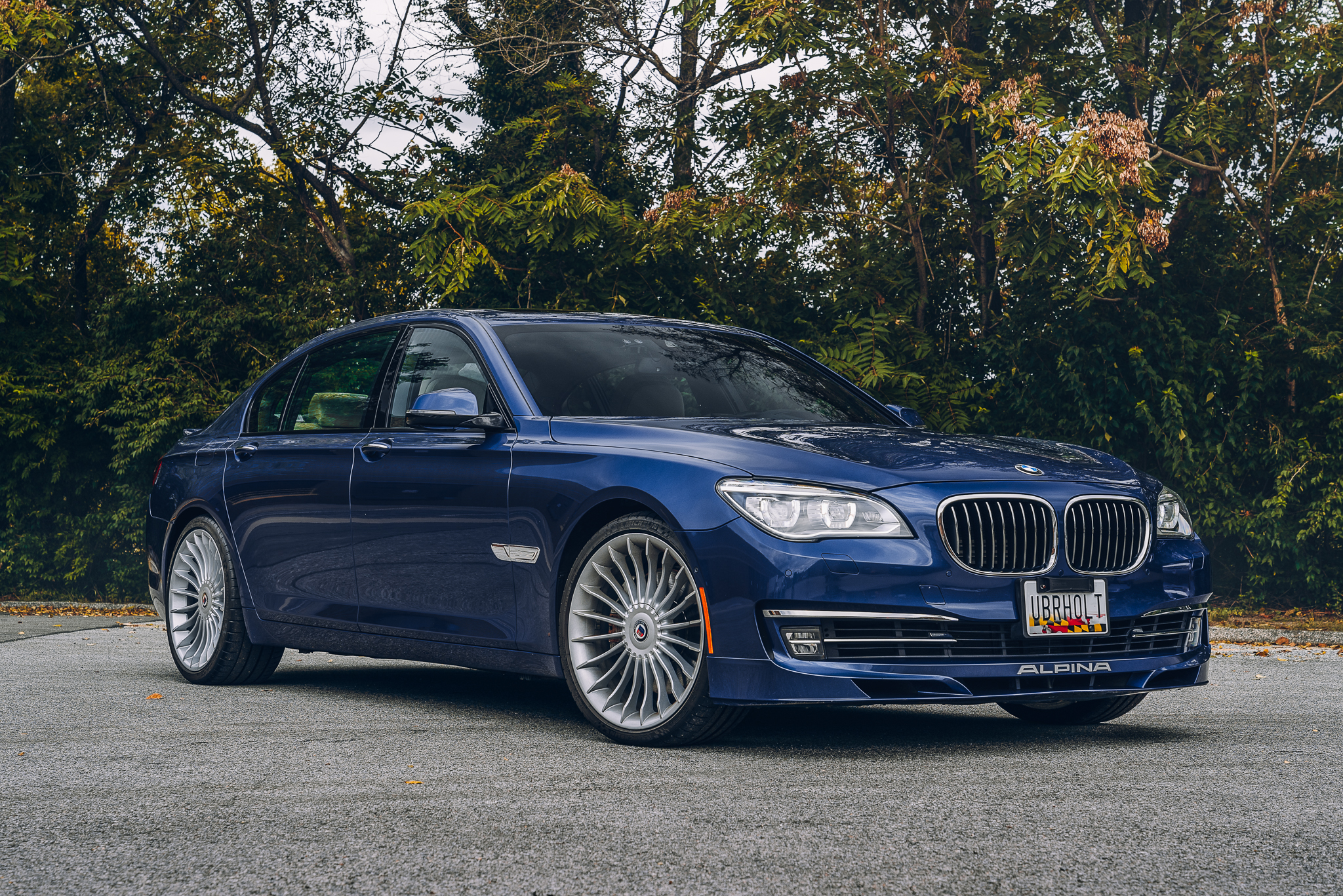 Alpina 21″ turbine-style wheels wear Michelin Pilot Super Sport tires. The car features an Alpina-tuned suspension as well as larger brakes and a lower ride height than the contemporary 7-Series. The brake pads and rotors were replaced in October 2020.