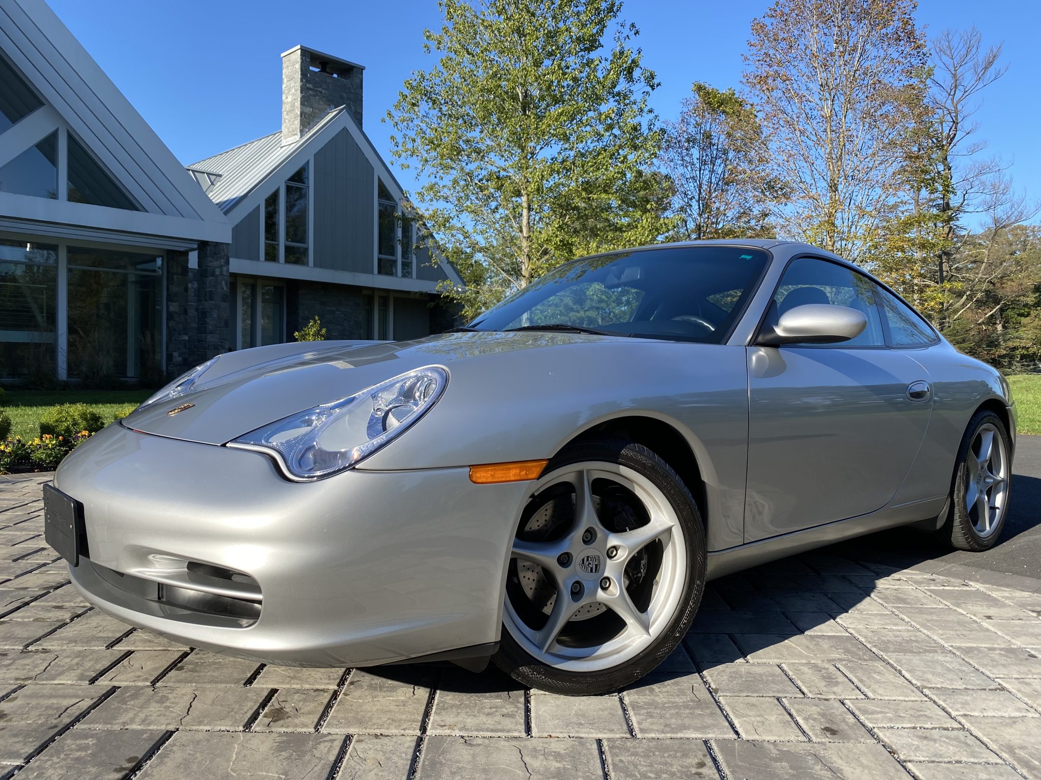 Factory 18″ wheels are mounted with 225/40 and 285/30 Continental Sport Contact 2 tires that show date codes from 2001. Stopping power is provided by black-painted brake calipers with white Porsche lettering fitted over cross-drilled rotors at each corner.