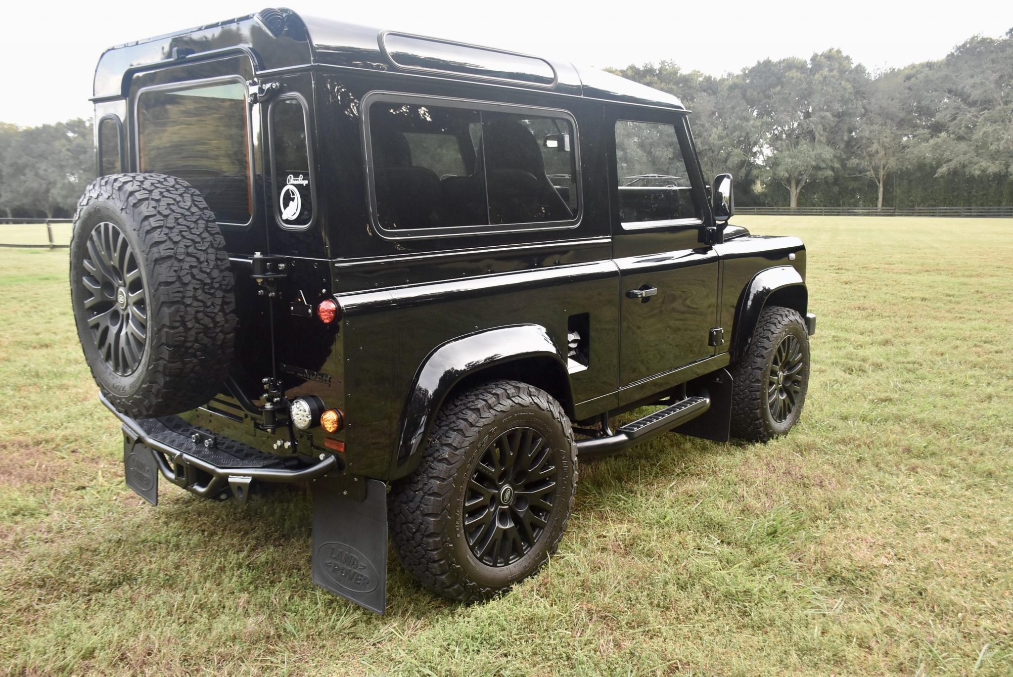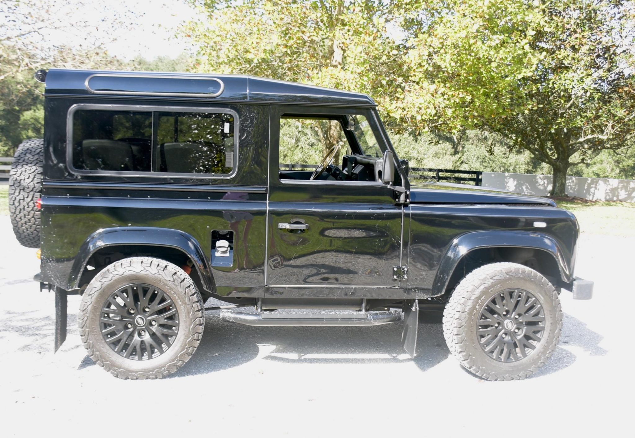 The 18″ Kahn 1983 wheels with Land Rover center caps are mounted with 265/65 BFGoodrich All-Terrain T/A tires, with a matching spare wheel mounted on a swing-away carrier out back. Braking is handled by front discs and rear drums.