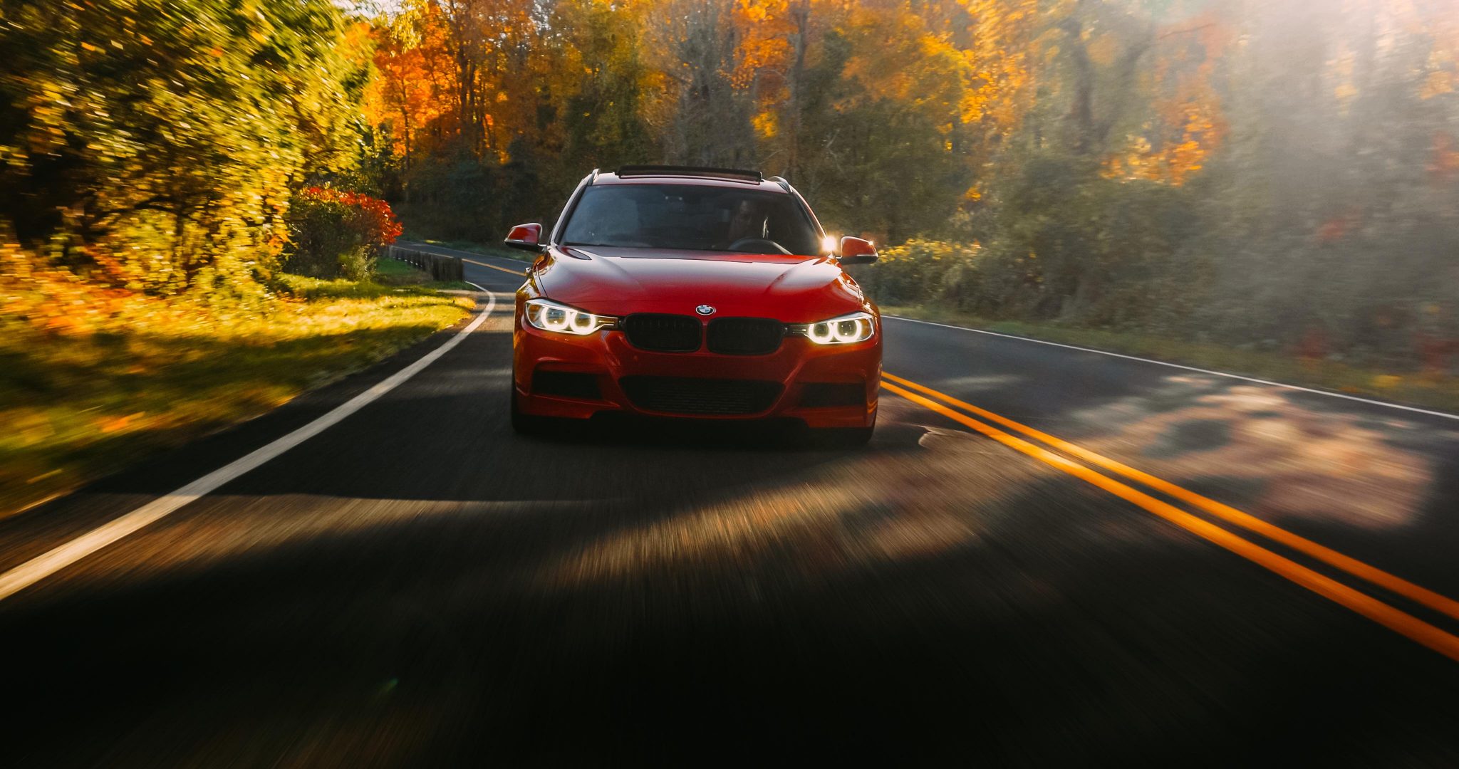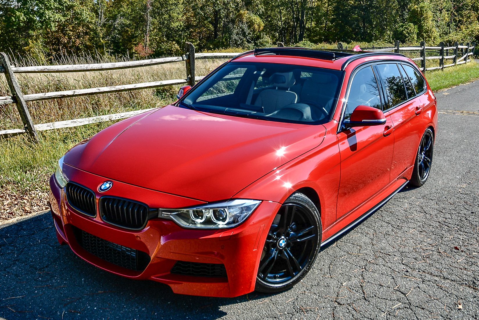 Factory 18″ Style 400 wheels are finished in black and wear 225/45 front and 255/40 rear Bridgestone Potenza S001 tires showing 2015 date codes. Driver aids include Active Driving Assistant, Active Blind Spot Detection, and Active Cruise Control. The car is equipped with height-adjustable KW coilovers and vented four-wheel disc brakes.