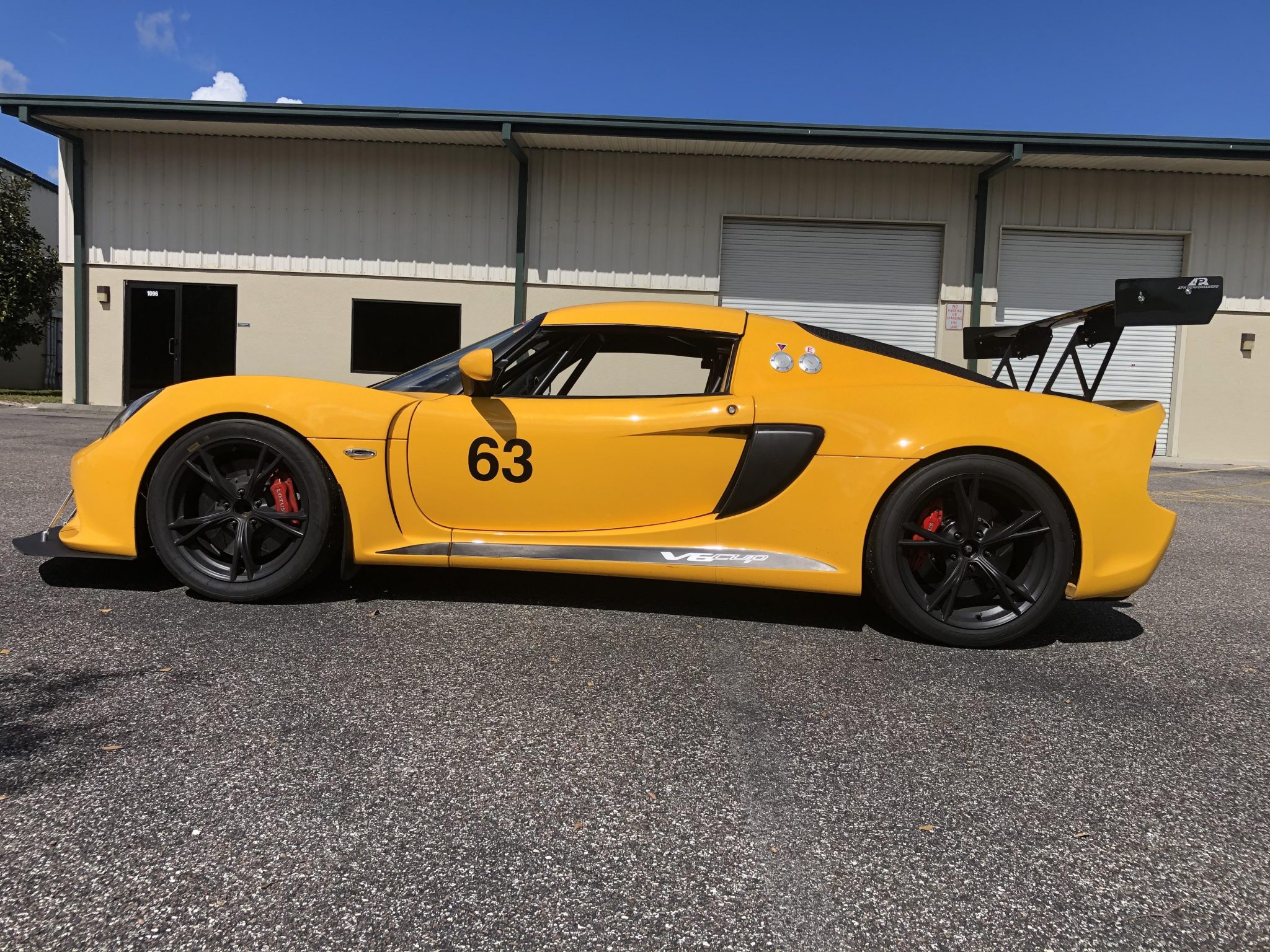 The staggered-diameter Lotus Racing five-spoke wheels are mounted with Pirelli P Zero DH slicks. Braking is handled by AP Racing calipers along with two-piece rotors, and aftermarket brake pads were installed by a previous owner. The suspension is fully independent and features double-wishbone control arms at all four corners with Nitron double-adjustable remote-reservoir coilover assemblies, and an adjustable Blackwatch Racing Ultralite SCCA/SS-specification front sway bar was installed by the seller.