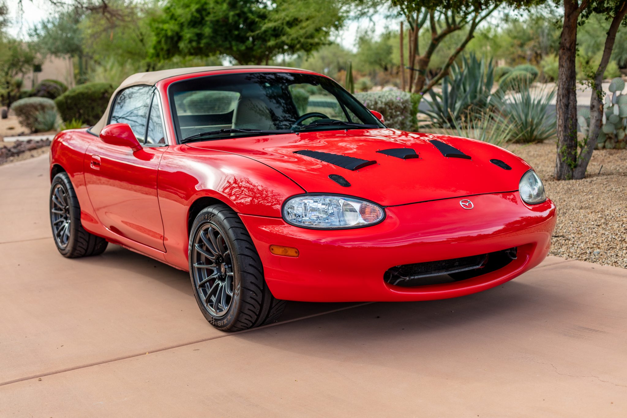 Gray Konig Dial-In wheels measure 15″ x 9″ and are mounted with 245/40 Maxxis Victra VR-1 tires at all four corners. The suspension has been modified using adjustable coilovers with Fox Racing Shox dampers, Flyin’ Miata V8-spec front and rear coilovers, and replacement rubber suspension bushings. A Wilwood big-brake kit with six- and four-piston calipers has also been installed, and in October 2020 the brake fluid was flushed.