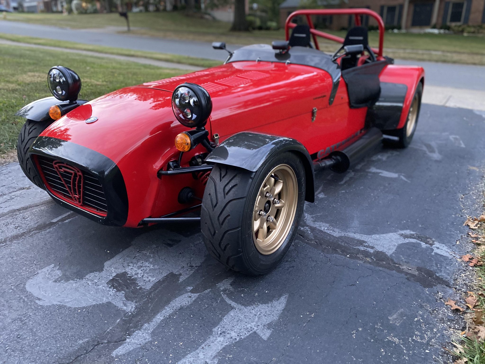 Gold-painted 13″ minilite-style wheels wear Yokohama A048 tires. Braking is provided by AP Racing four-piston calipers with vented discs up front and solid discs at the rear. The car is reportedly equipped with a Caterham quick steering rack and de Dion rear suspension.