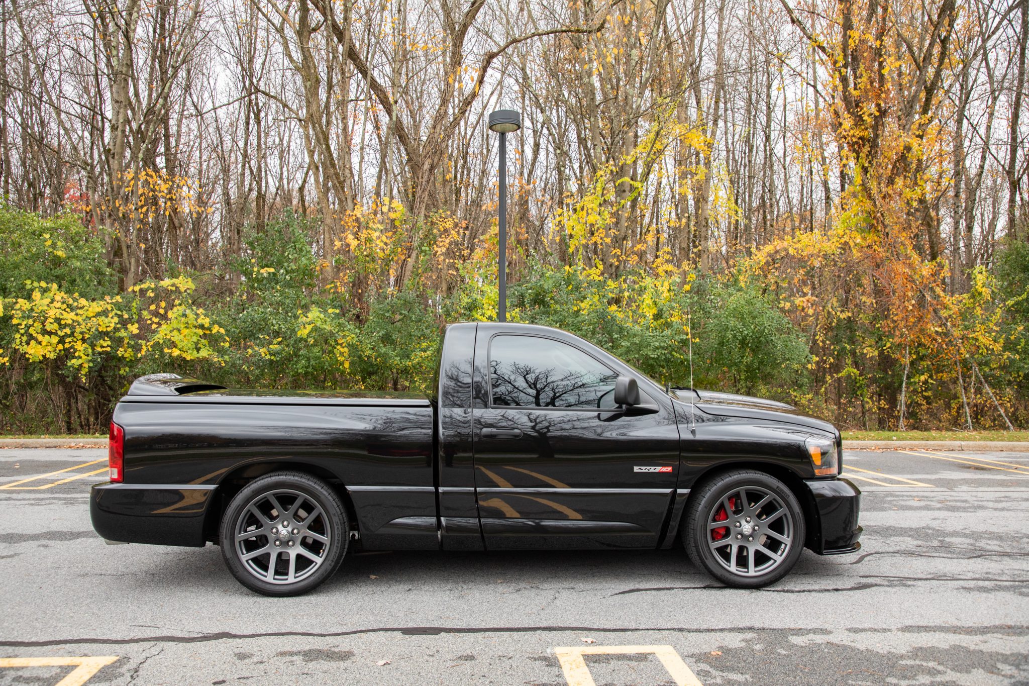 Factory Dark Nickel Pearl-finished 22″ alloy wheels were unique to the Night Runner, and within the last 1k miles the seller mounted replacement 305/40 Pirelli Scorpion Zero ASIMMETRICO tires at all four corners. Braking is handled by model-specific four-piston TRW calipers acting on ventilated rotors at the front, while the rear discs are shared with heavy duty Ram models. From the factory the SRT-10 rode 1″ lower at the front and 2.5″ lower at the rear than the standard Ram, and this example has been lowered a further 1″ at the front with aftermarket lowering springs, and the rear has been lowered 2″ with billet aluminum blocks and extended U-bolts. A walkaround video is viewable here.