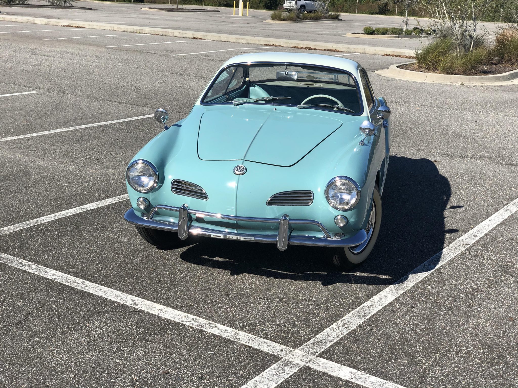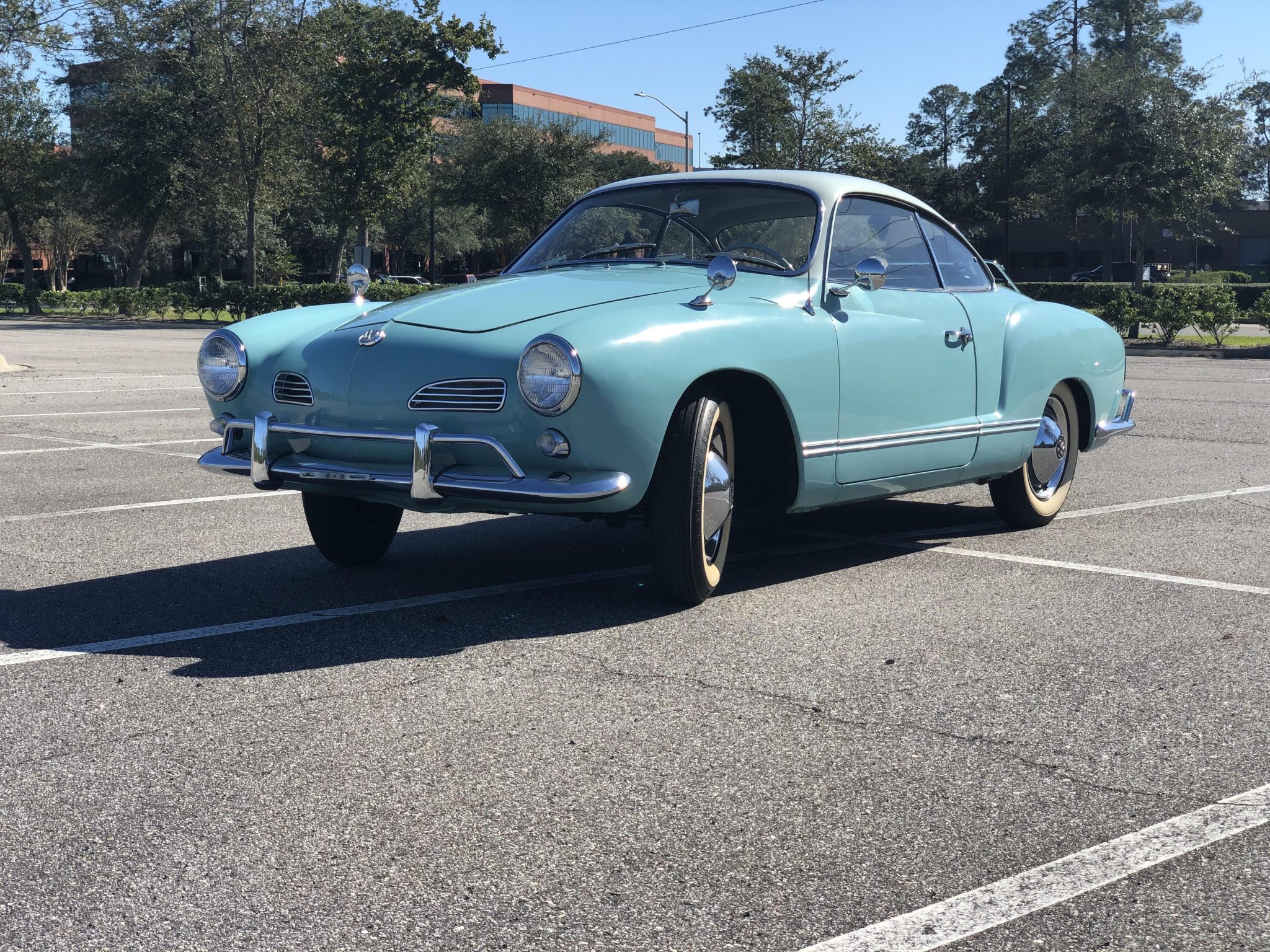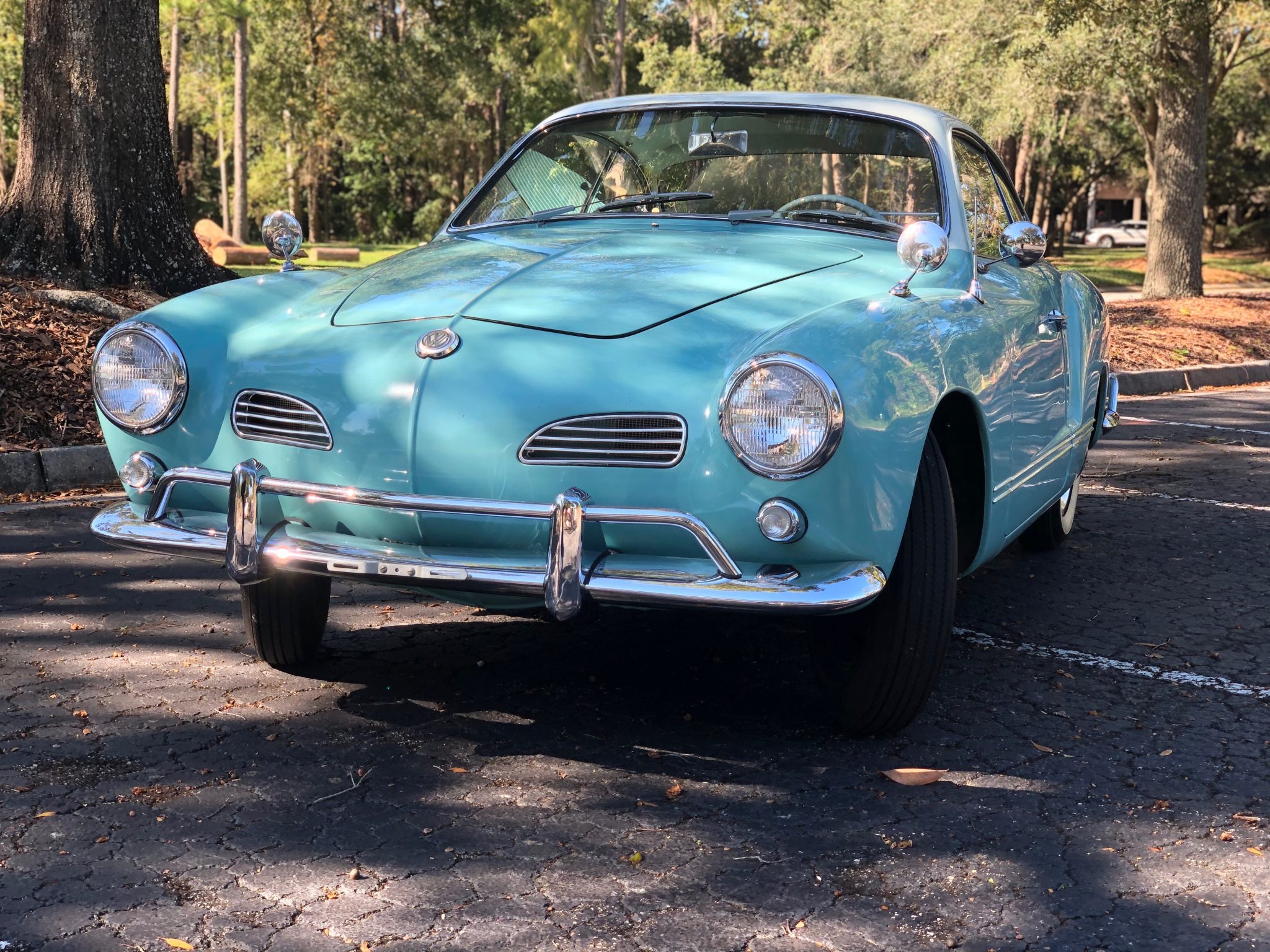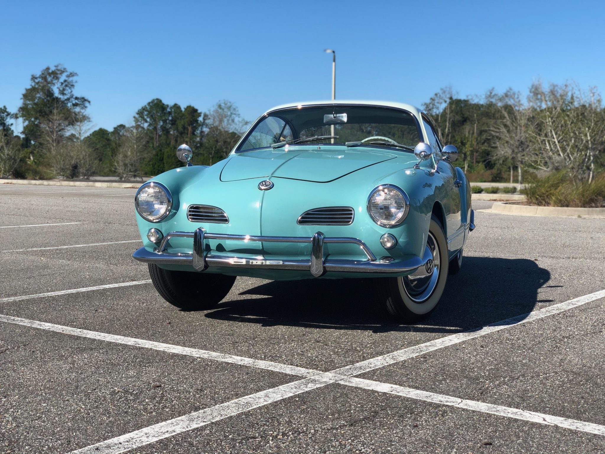 Steel 15” wheels have been painted to match the body and wear chrome trim rings, VW-branded hubcaps, and U.S. Royal whitewall tires.
