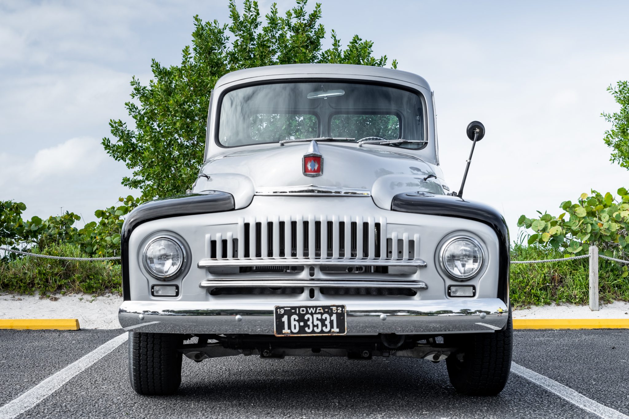 The 16″x8″ steel wheels are painted silver and wear chrome trim rings and dog dish hubcaps along with American Classic whitewall tires measuring 235/70. An independent front suspension and leaf-sprung rear axle from a Ford Crown Victoria have been added, along with disc brakes at all four corners and power steering.