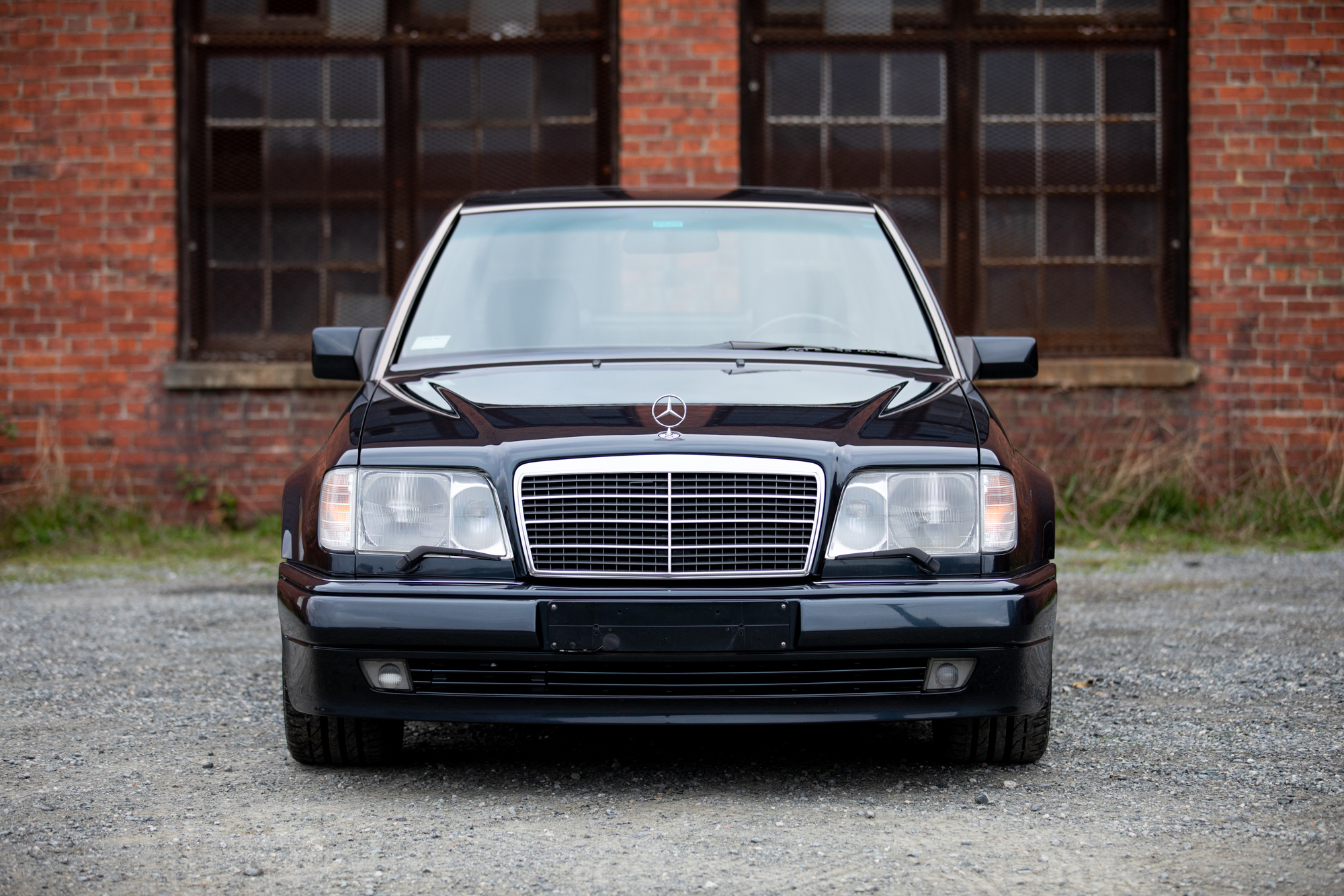 The 17″ Evo wheels were included from the factory and are wrapped in Bridgestone Potenza S001 245/45 tires. A matching spare wheel is fitted under the trunk floor. The E500 featured a wider track and a lower stance compared to other W124 models, while the front disc brakes were shared with the contemporary R129 SL600.
