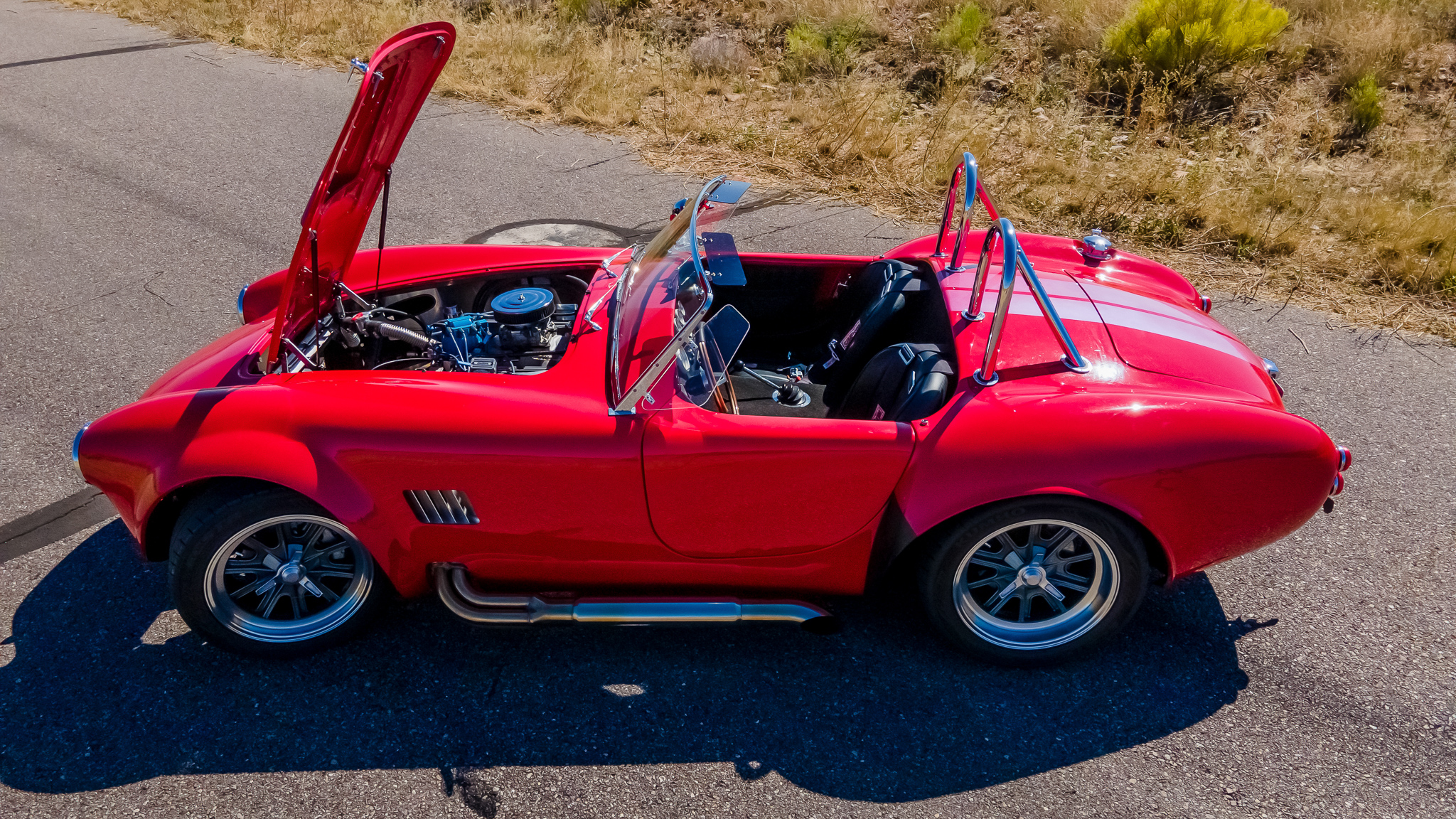 17″ Halibrand-style wheels with simulated knock-offs wear Kumho Ecsta tires measuring 245/45 up front and 315/35 out back and showing a mix of date codes. Disc brakes with heavy-duty pads are fitted at all four corners.