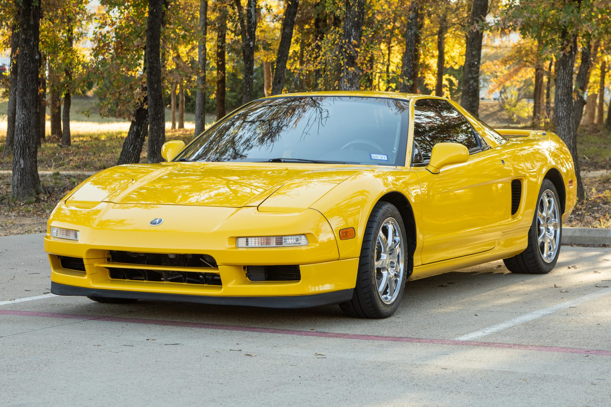 Staggered 16” front and 17” rear chrome wheels are mounted with Kumho Ecsta XS tires measuring 215/45 up front and 245/40 out back. Factory equipment includes aluminum suspension components and four-wheel disc brakes with yellow-painted calipers.
