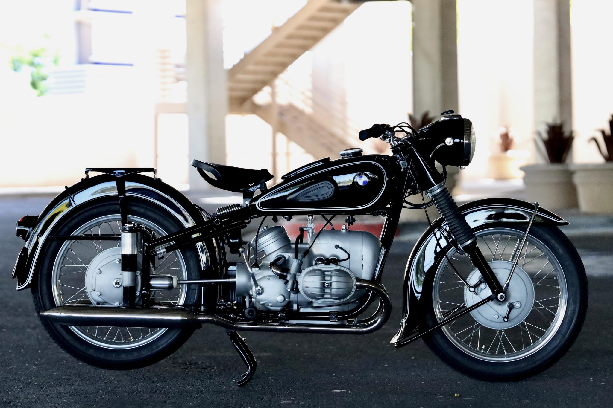 The wheels were fitted with rebuilt hubs and chrome spokes during the 2009 work, while new period-style tires are said to have been mounted in 2019 under previous ownership. Suspension consists of a rebuilt conventional fork with black rubber gaiters as well as dual plunger shocks in the rear. Braking is from drums with relined shoes at both ends.