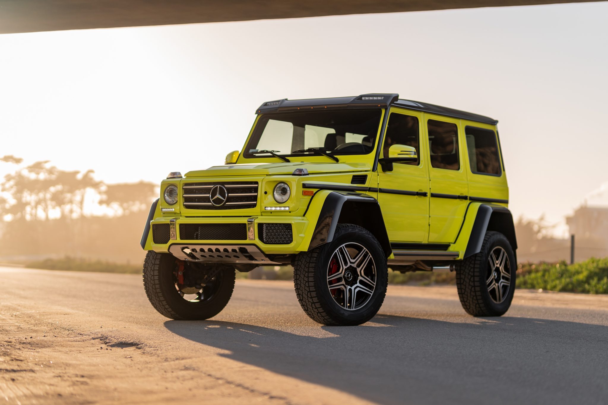 Factory 22″ alloy wheels are wrapped in 325/55 Pirelli Scorpion ATR tires. The truck is equipped with portal axles and two parallel coilovers per corner, which results in 17.7″ of ground clearance and a water fording depth limit of 39″. Braking is handled by cross-drilled rotors and red-finished six-piston front calipers.