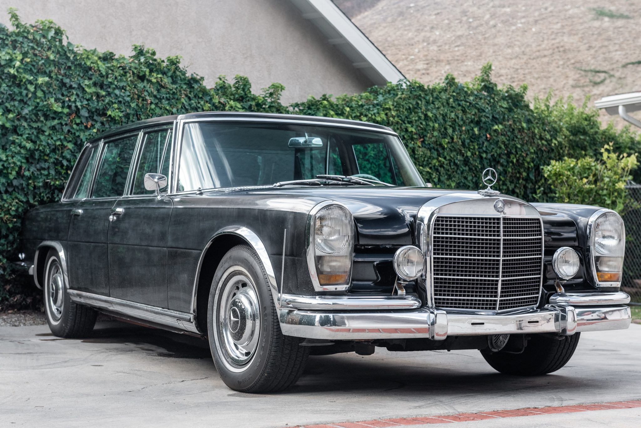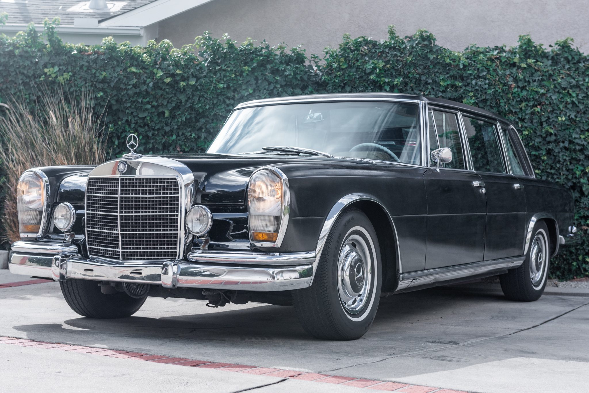 Steel 15” wheels wear two-piece chrome covers with body-color centers and are mounted with Michelin XW4 whitewall tires. Lighting includes European-market headlamps with single-piece glass covers and bumper-mounted foglamps, while side markers are absent. A flag holder is mounted on the passenger side of the front bumper.