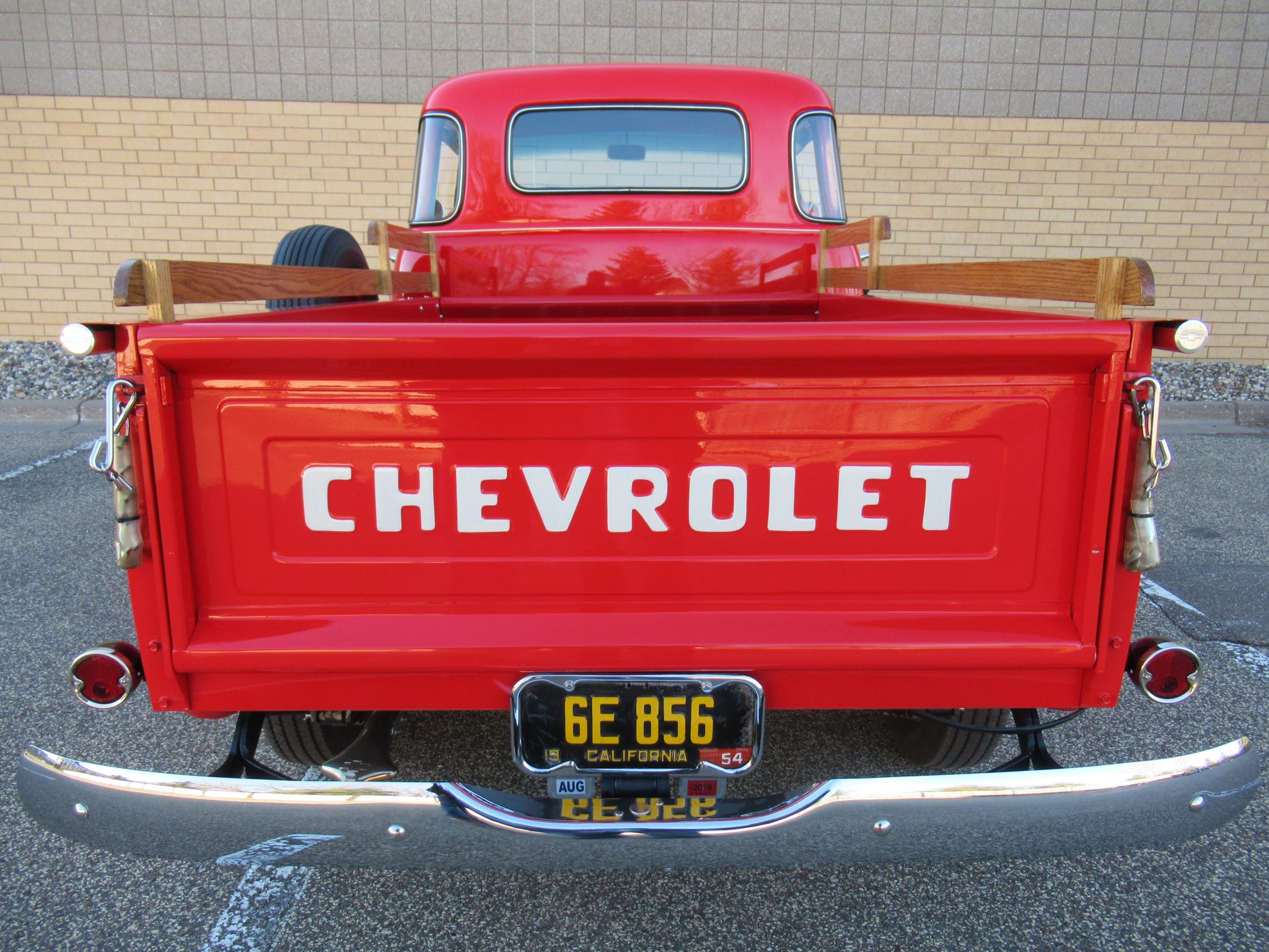 Red-painted 15″ steel wheels with polished trim rings and hubcaps wear Silvertown wide whitewall tires, and a spare wheel and tire are mounted on the left side of the bed. Equipment includes drum brakes and leaf spring suspension.