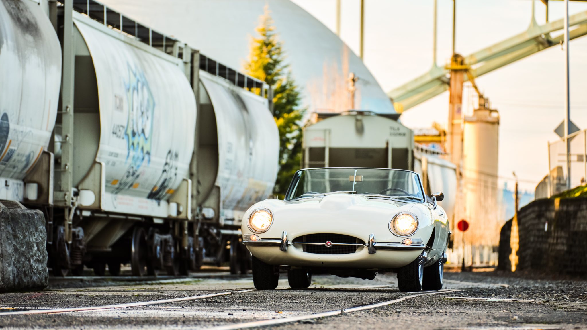 Chrome 15″ wire wheels are secured by three-lobed knock-offs, which were introduced on US-market XKEs beginning in 1968. Vredestein Sprint Classic tires are mounted all around, as well as on the matching spare. The black soft top can be stowed under a color-matched boot.