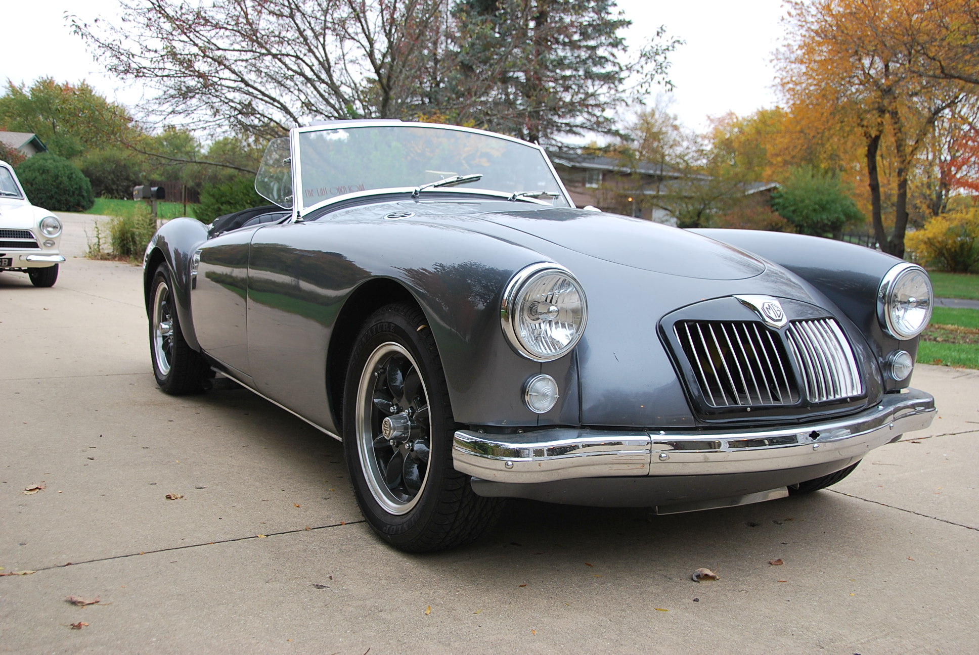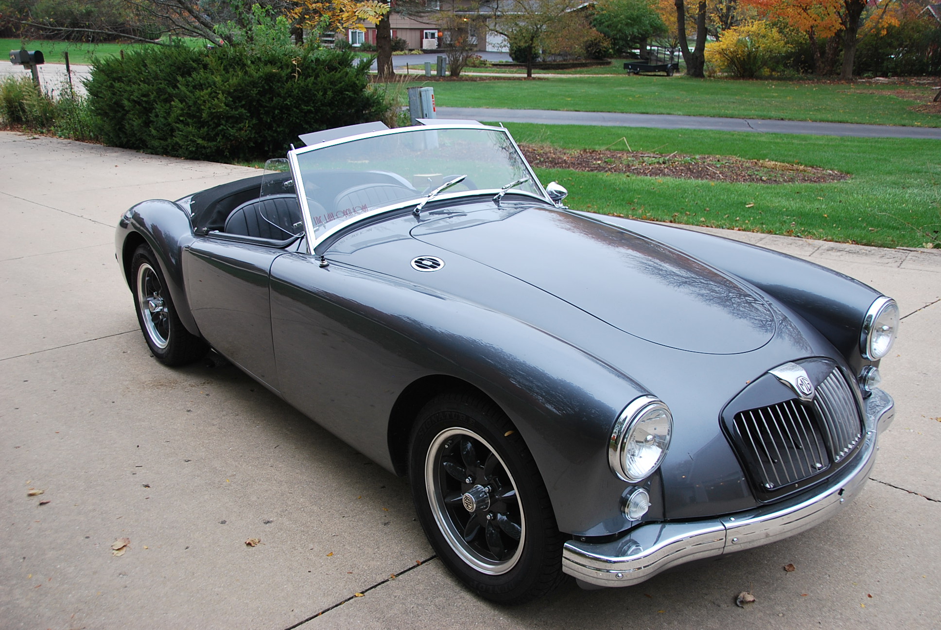 Minilite-style 15″ wheels feature black inserts, polished lips, and MG center caps, and they are mounted with Dunlop Signature tires. Suspension and braking components were sourced from an MGB and installed in 2012.