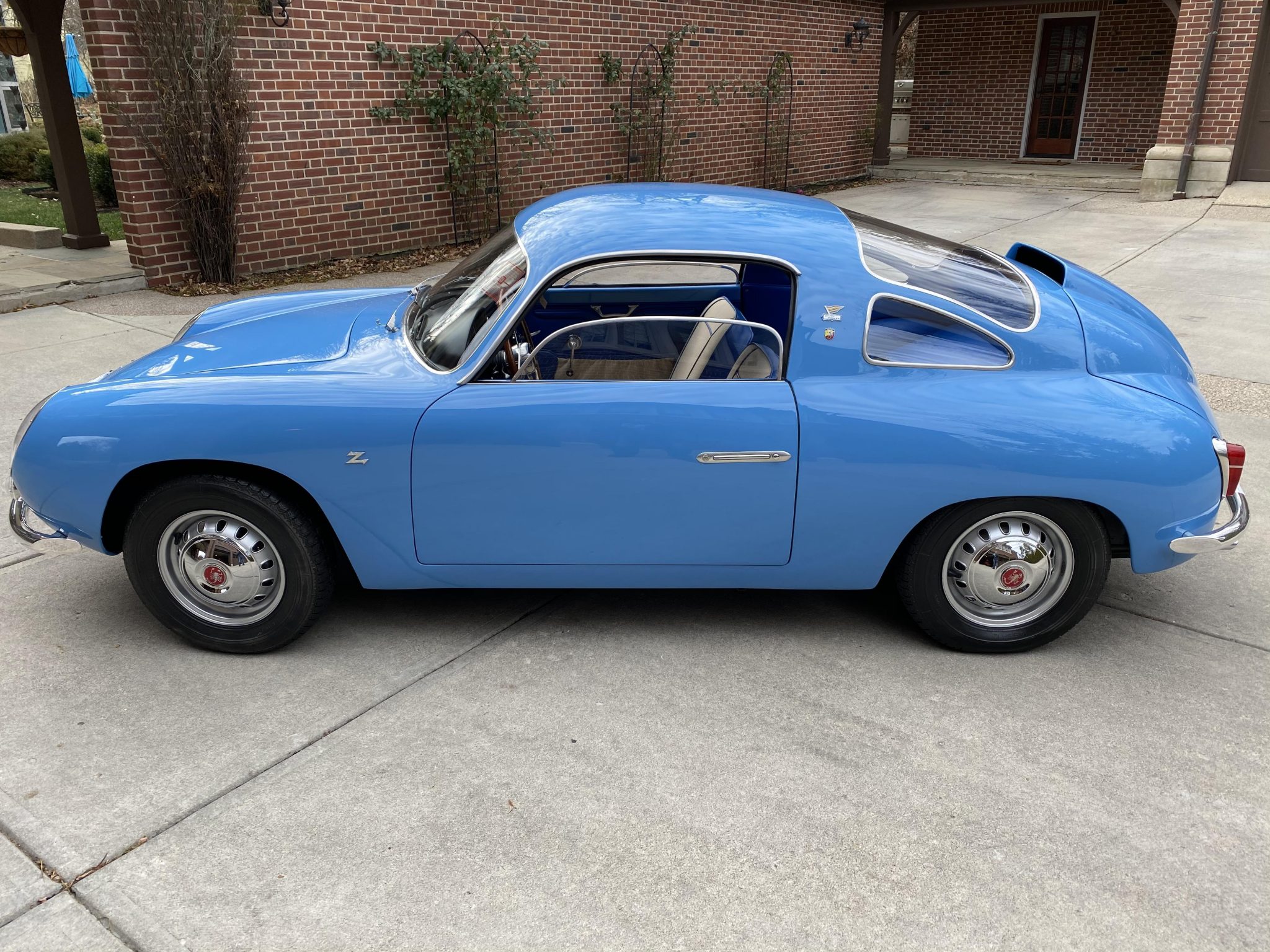 12″ Fergat steel wheels wear chrome Abarth hubcaps and are wrapped in 145-series Michelin XZX tires. Braking is handled by front discs and rear drums, and the car rides on a transverse leaf spring up front and coil springs out back.