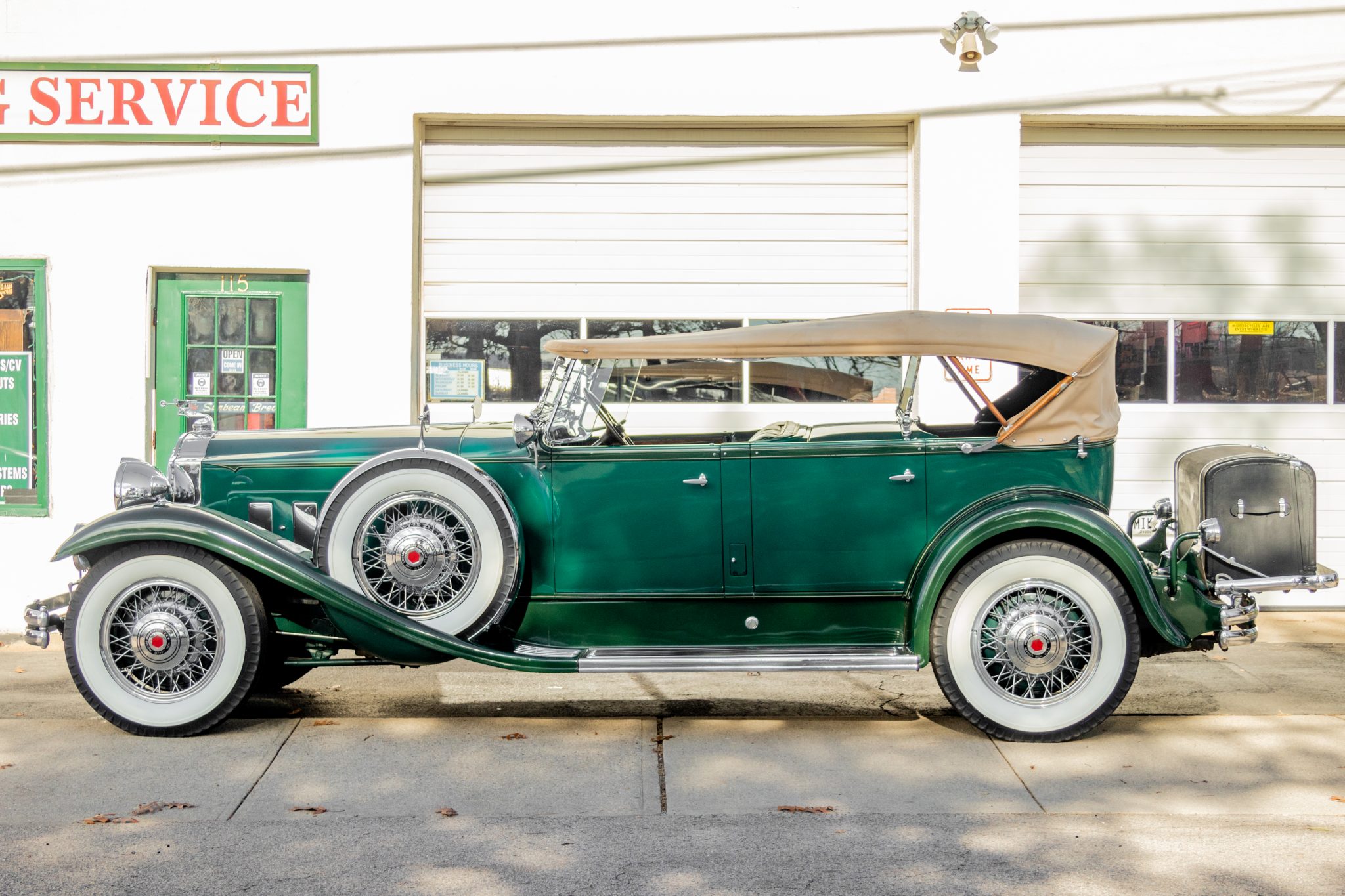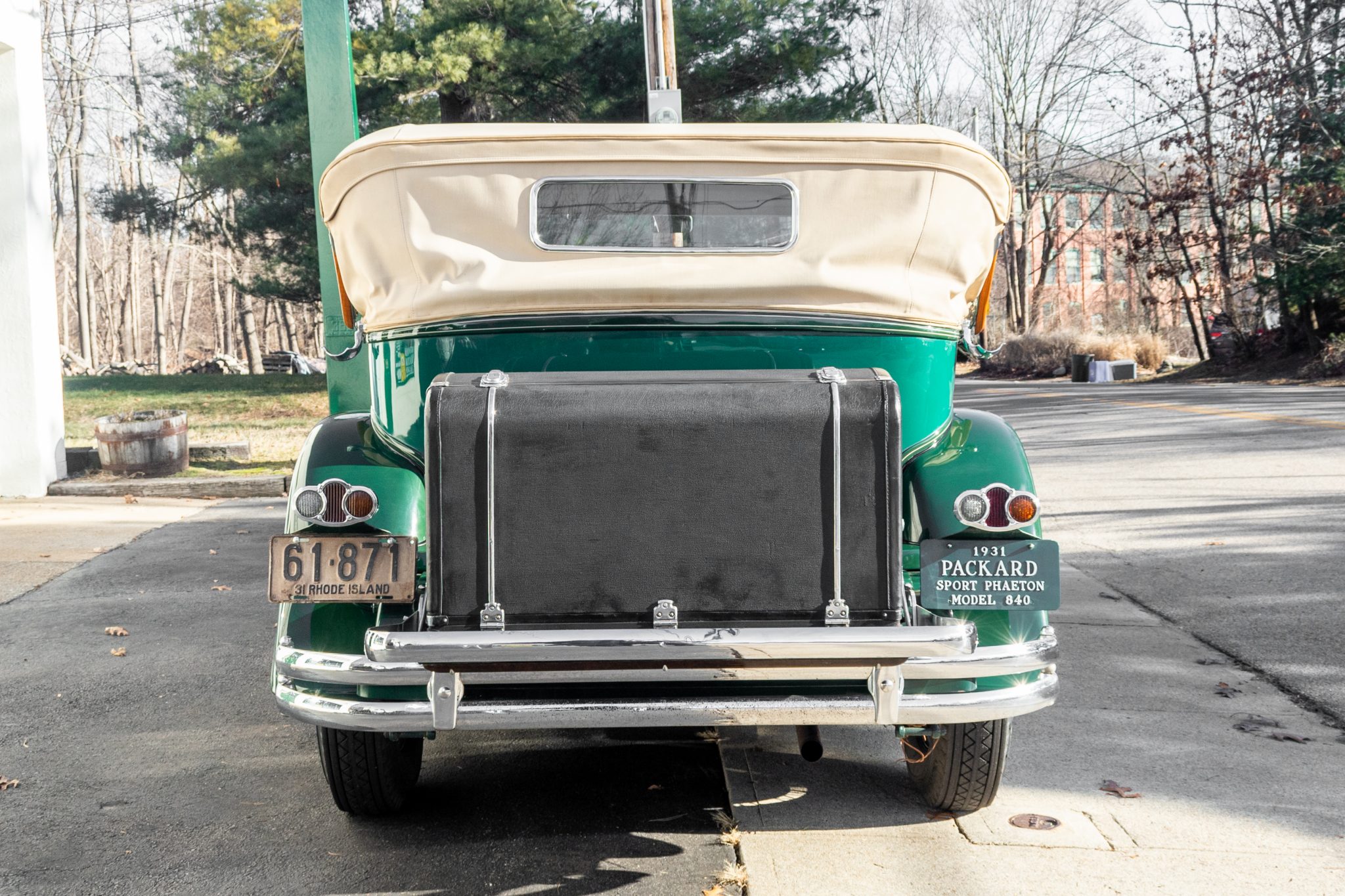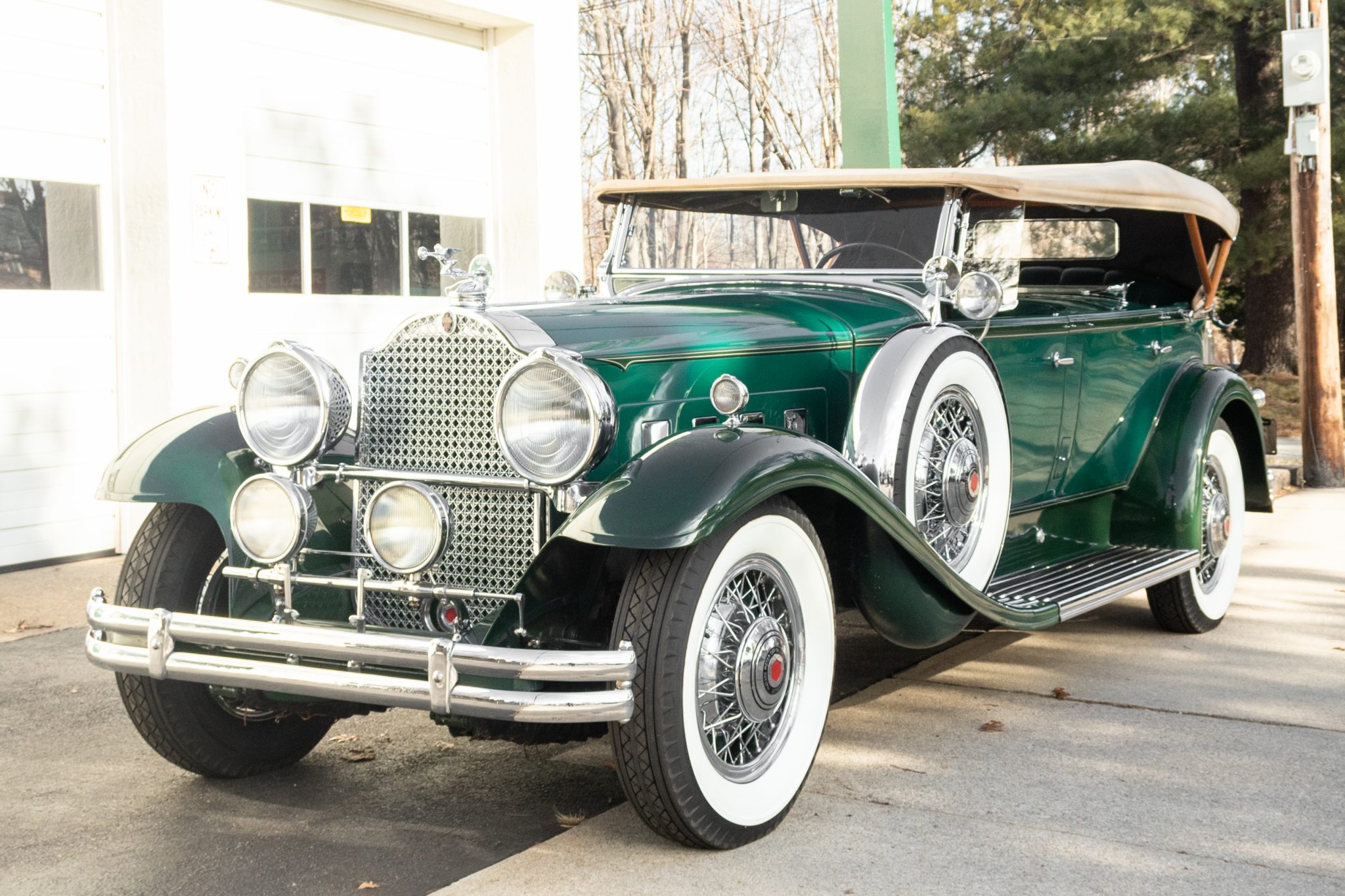 The wire wheels have reportedly been re-chromed and are mounted with wide whitewall Firestone WW tires that were installed in 2020. Matching spares are housed along the side of both front fenders. The four-wheel drum brakes were refreshed in July 2020 by Parker’s Packards of Holden, Massachusetts.