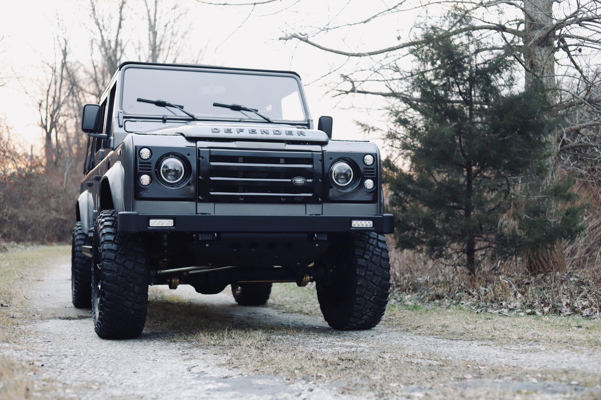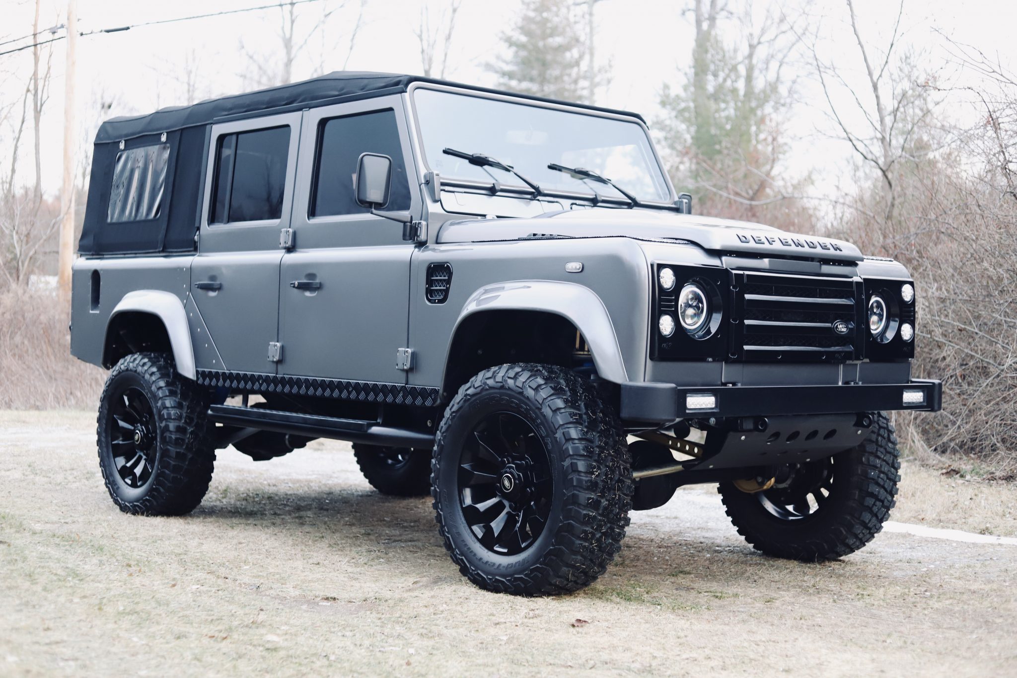 Black-finished 18″ Land Rover Sawtooth wheels wear 275/70 BFGoodrich Mud-Terrain T/A tires, and a matching spare wheel and tire are mounted out back on a swing-out carrier. A suspension lift was installed after the truck was imported, and braking power is supplied by cross-drilled and slotted front discs along with rear drums.