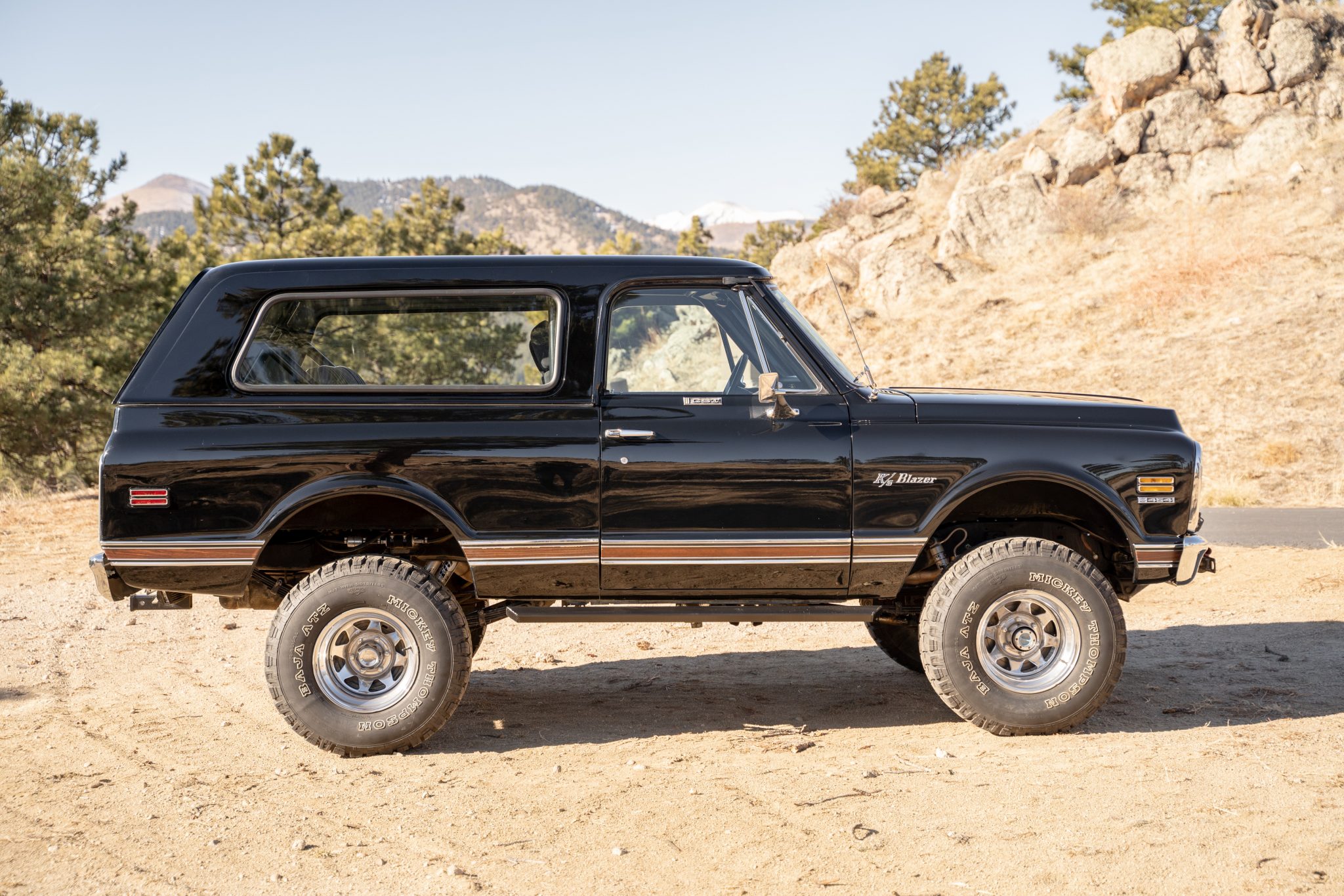 The 15″ chrome six-lug wheels feature manually locking front hubs and are mounted with 33×12.5″ Mickey Thompson Baja ATZ tires. A 2.5″ lift kit is fitted along with custom leaf springs, Fox remote-reservoir shocks, and an ARB rear air locker with twin air compressors and an air locker manifold. Braking is handled by front discs, rear drums, and a Hydroboost master cylinder. A custom 3” exhaust system is fitted along with a Flowmaster muffler.
