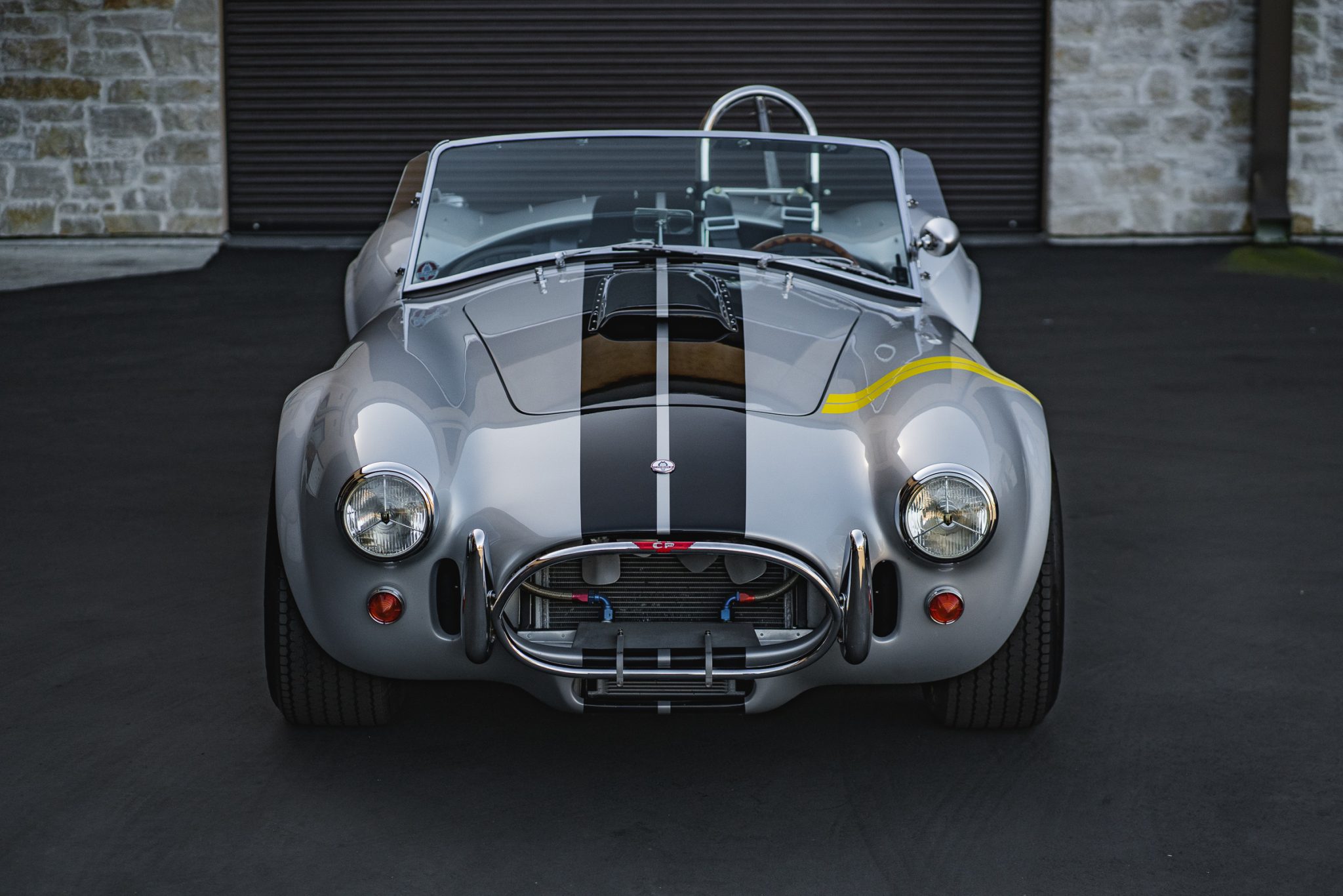 Gray 15″ aluminum pin-drive wheels are mounted with stainless-steel three-ear Cobra Racing knockoffs, and they are wrapped in 26.5″ x 8.0″ front and 26.5″ x 10.5″ rear Goodyear Eagle Sport Car Special tires. Each corner is equipped with Baer disc brakes.
