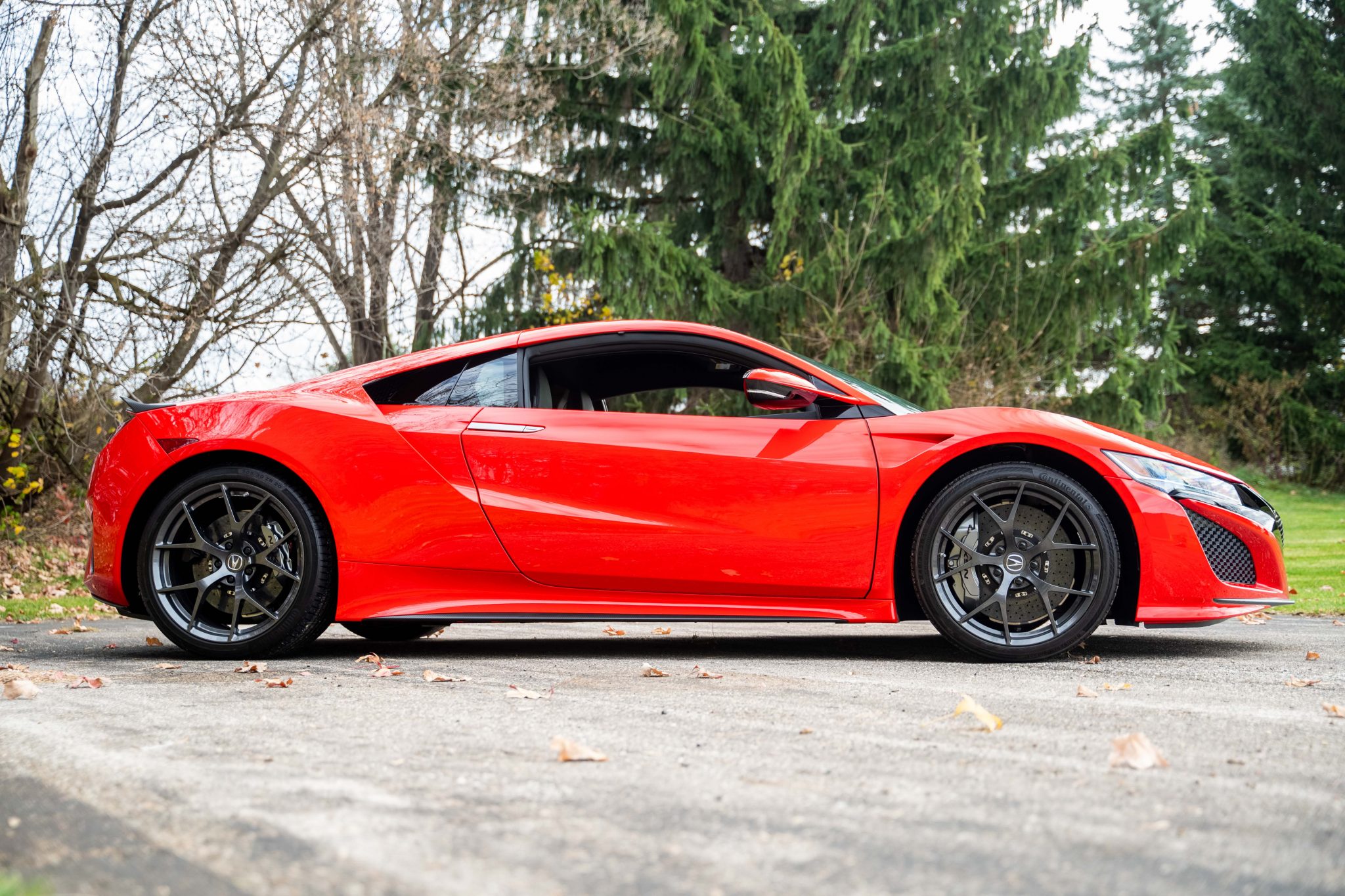 Factory 19″ front and 20″ rear Y-spoke wheels are mounted with Continental ContiSportContact tires. The car is equipped with a carbon-ceramic brake system and silver-finished calipers. The second-generation NSX utilizes double-wishbone front and multi-link rear suspension with magnetorheological dampers at each corner.