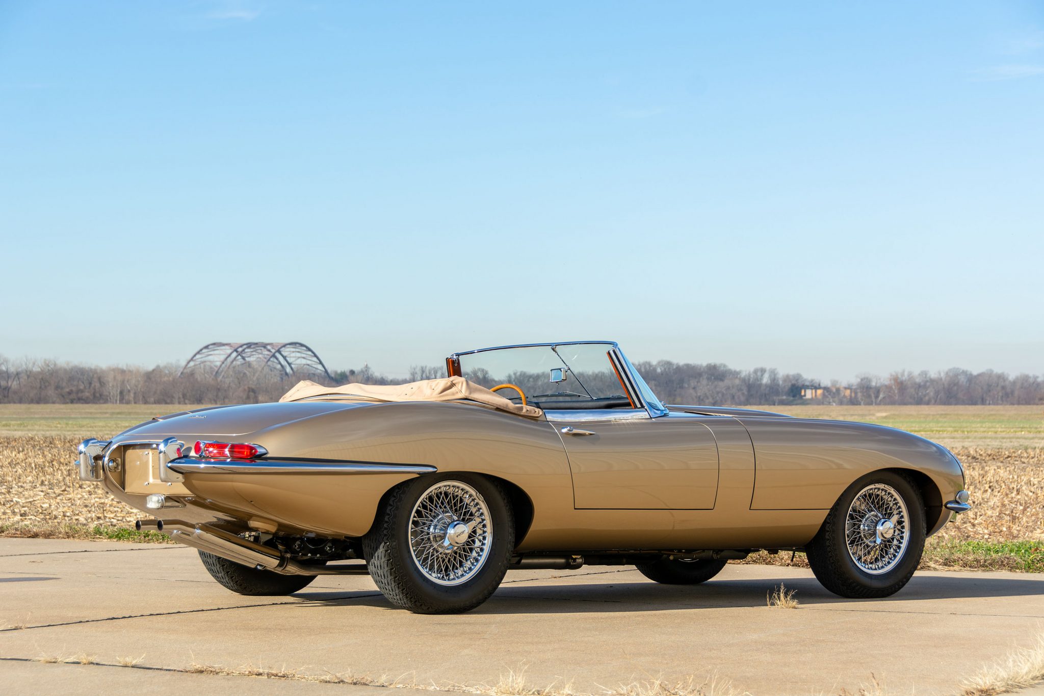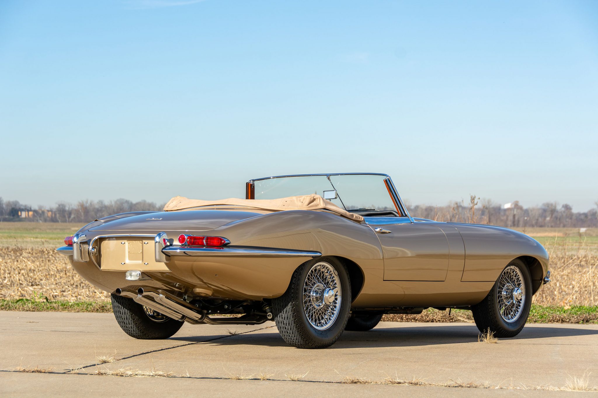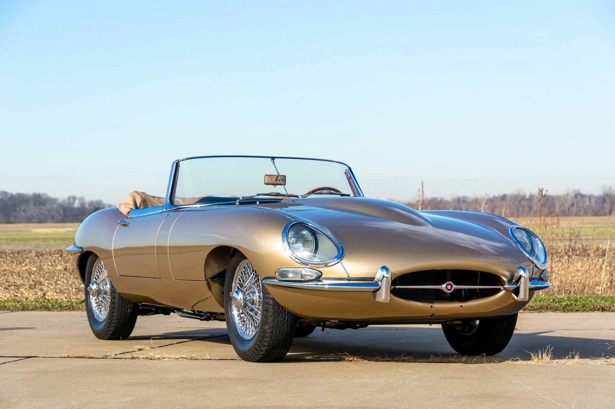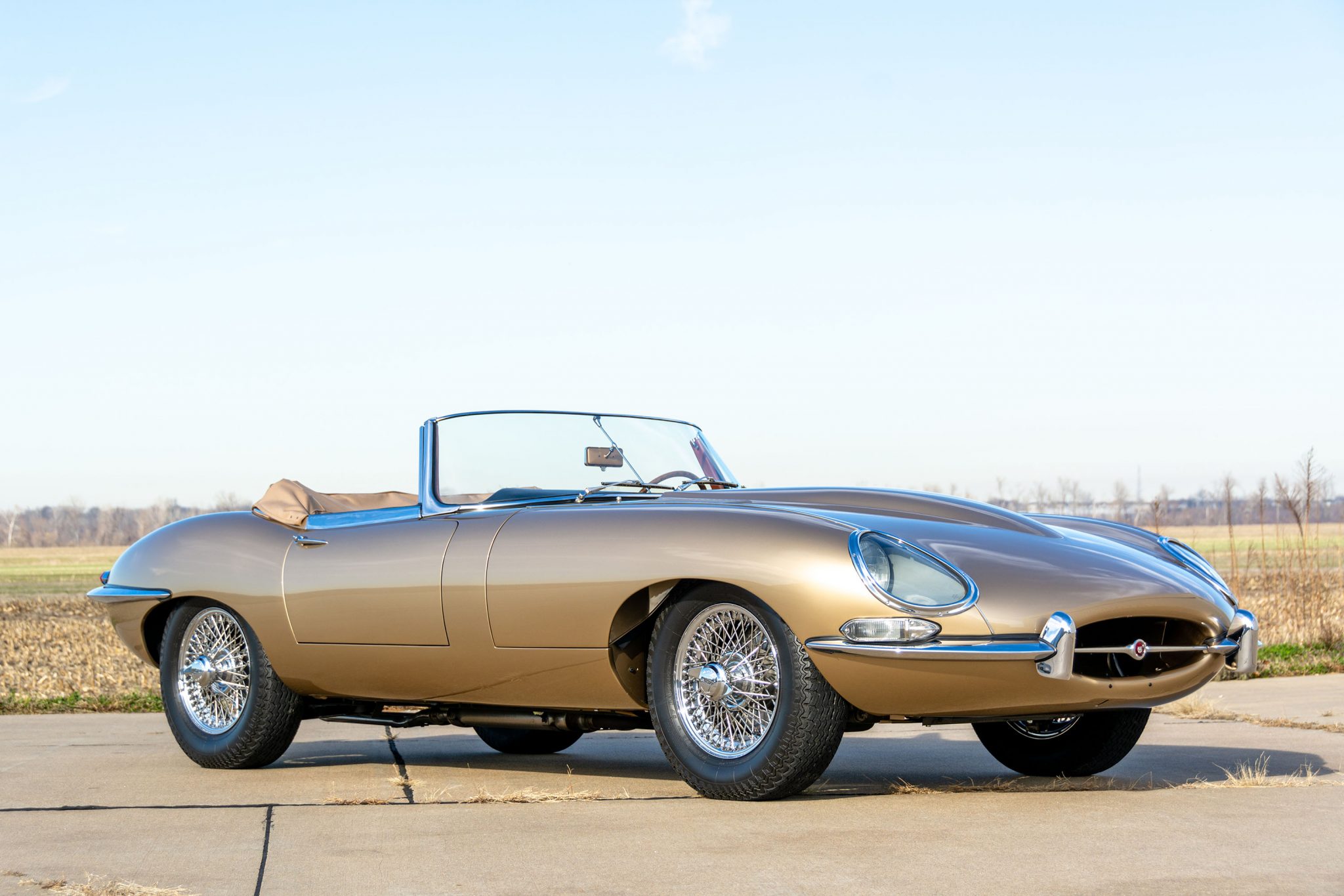 The tan soft top can be seen up close in the gallery below. Chrome knock-off 15″ wire wheels with two-eared spinners are mounted with Dunlop SP Sport radial tires, with a matching spare wheel stored under the trunk floor. Braking is handled by four-wheel discs with inboard rotors at the rear.