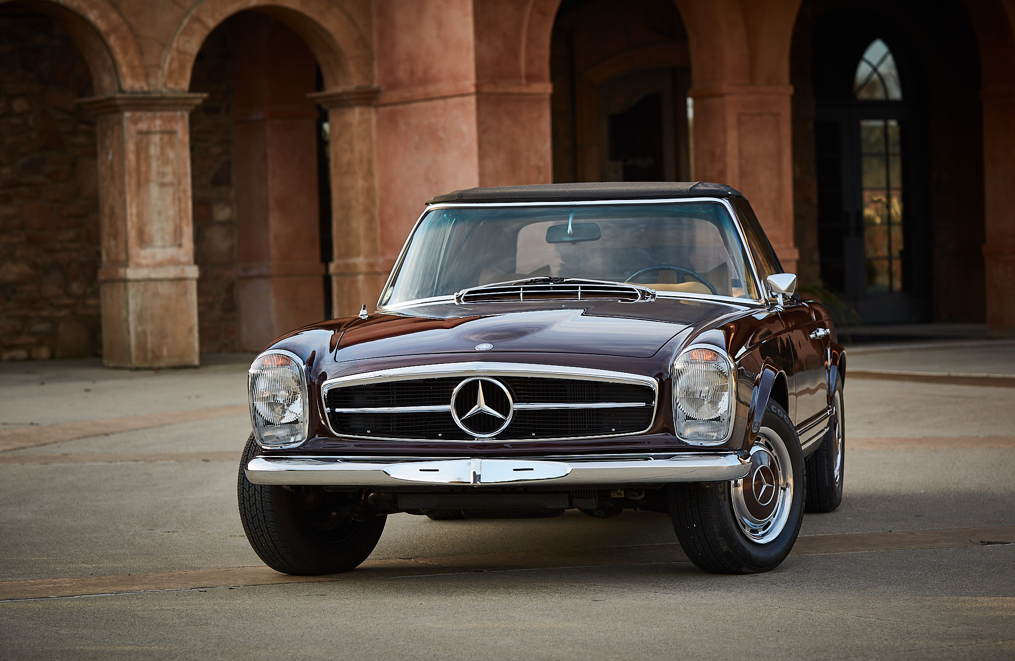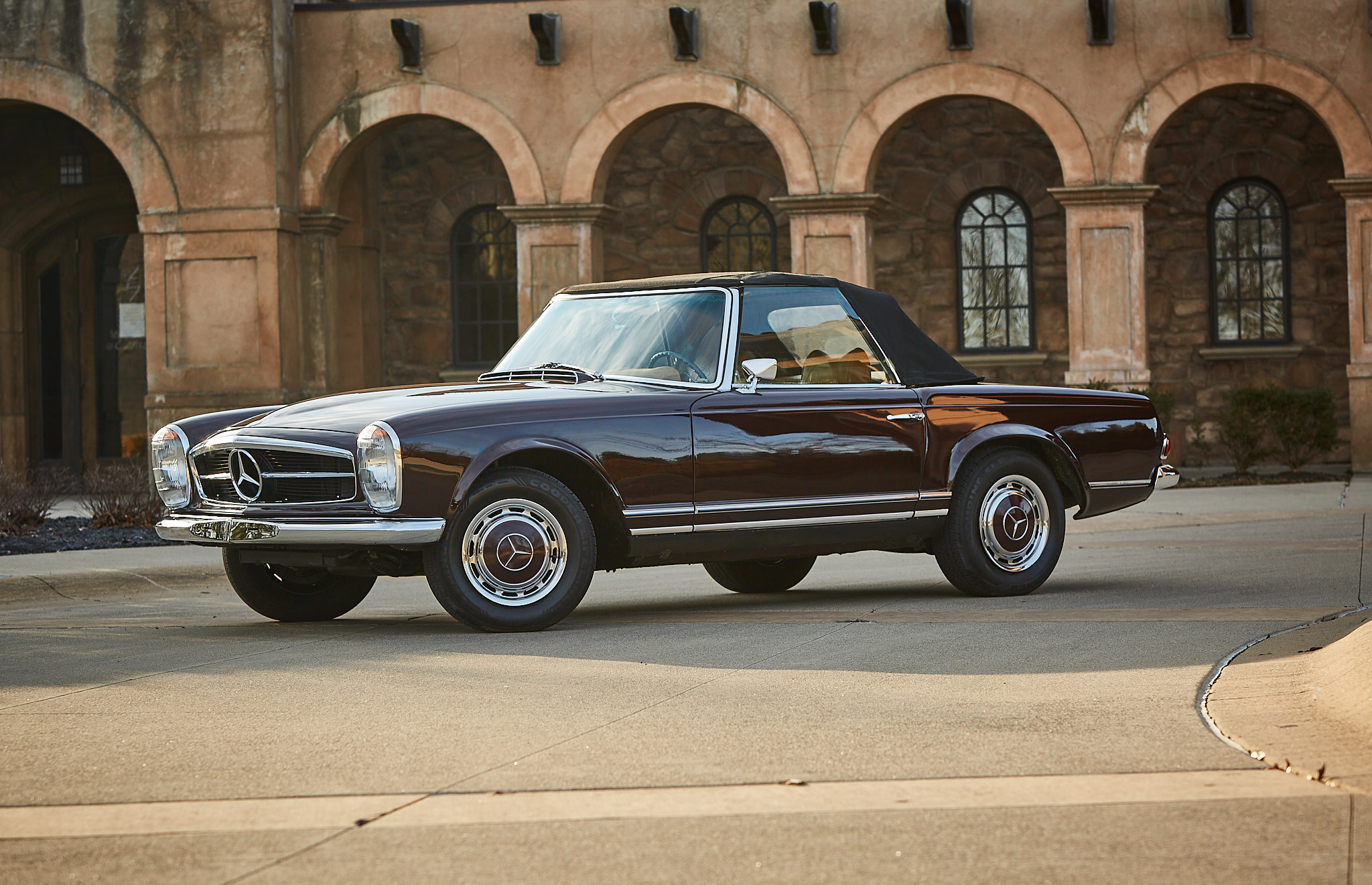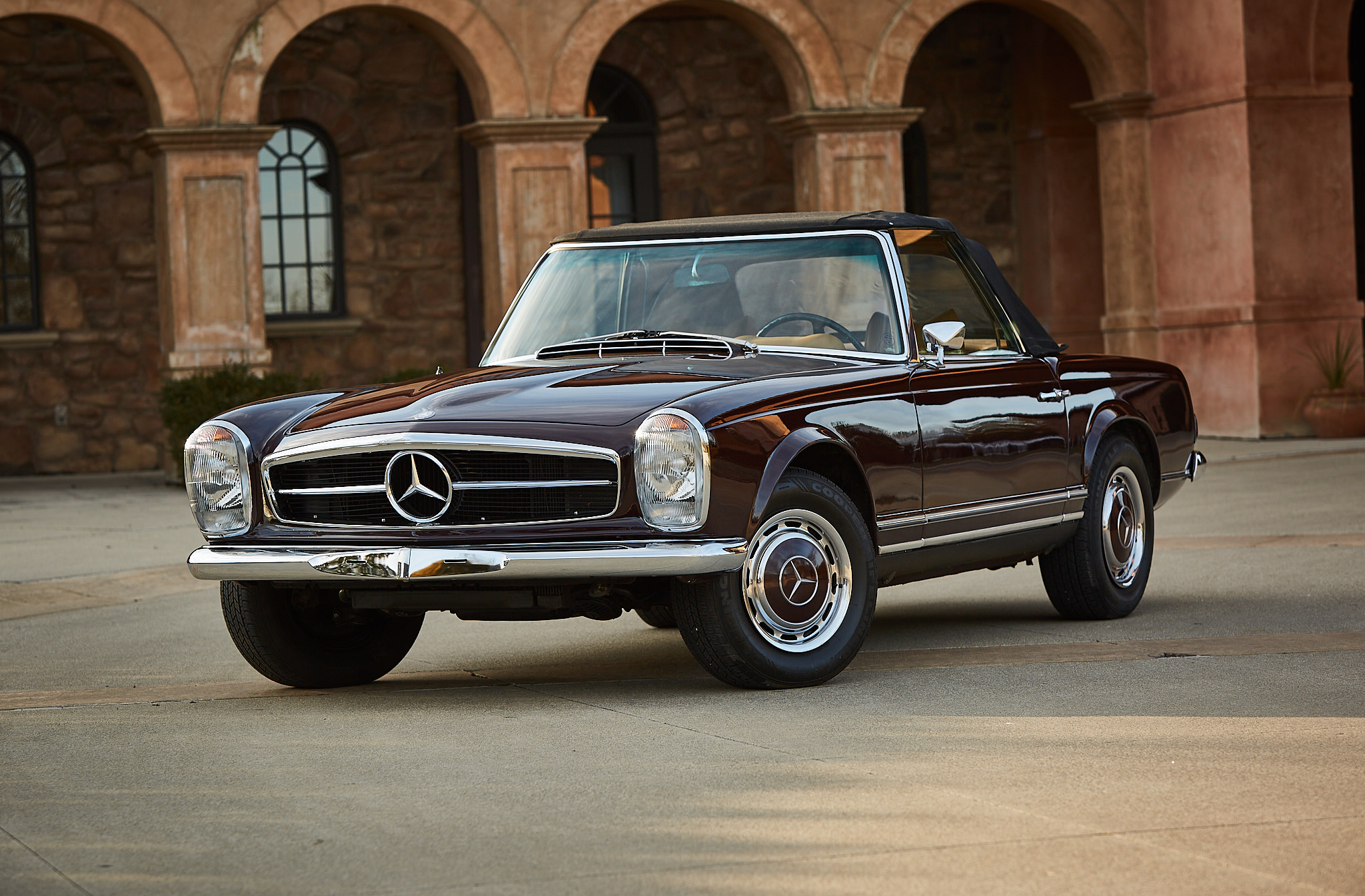 Black 14″ steel wheels wear polished covers with body-colored centers, and Cooper Lifeliner Touring SLE radial tires are fitted all around. The convertible top was retrimmed with black canvas fabric sourced from Germany, and retracts manually to store beneath the bodywork. A body-colored hardtop is included in the sale.