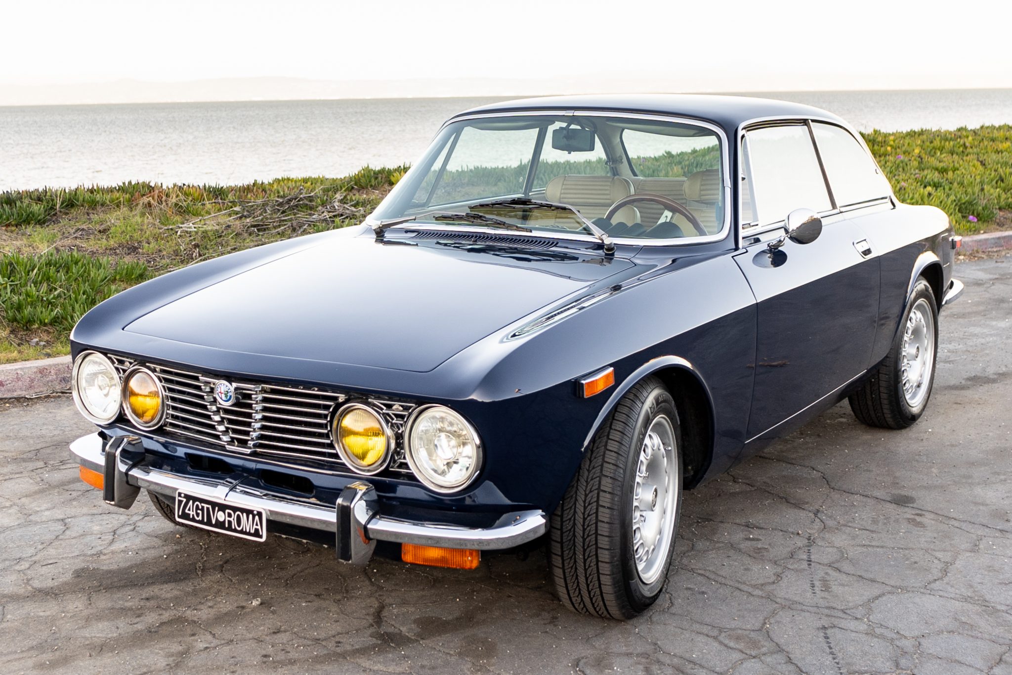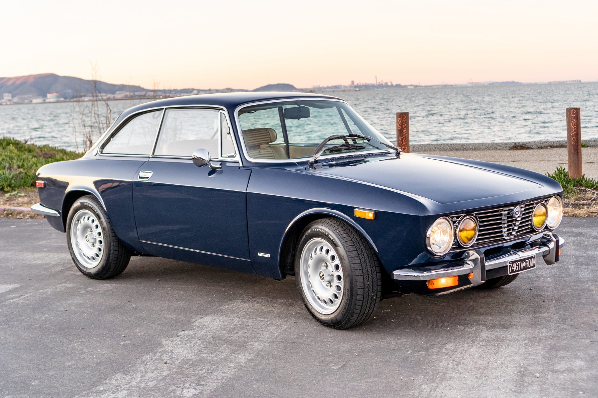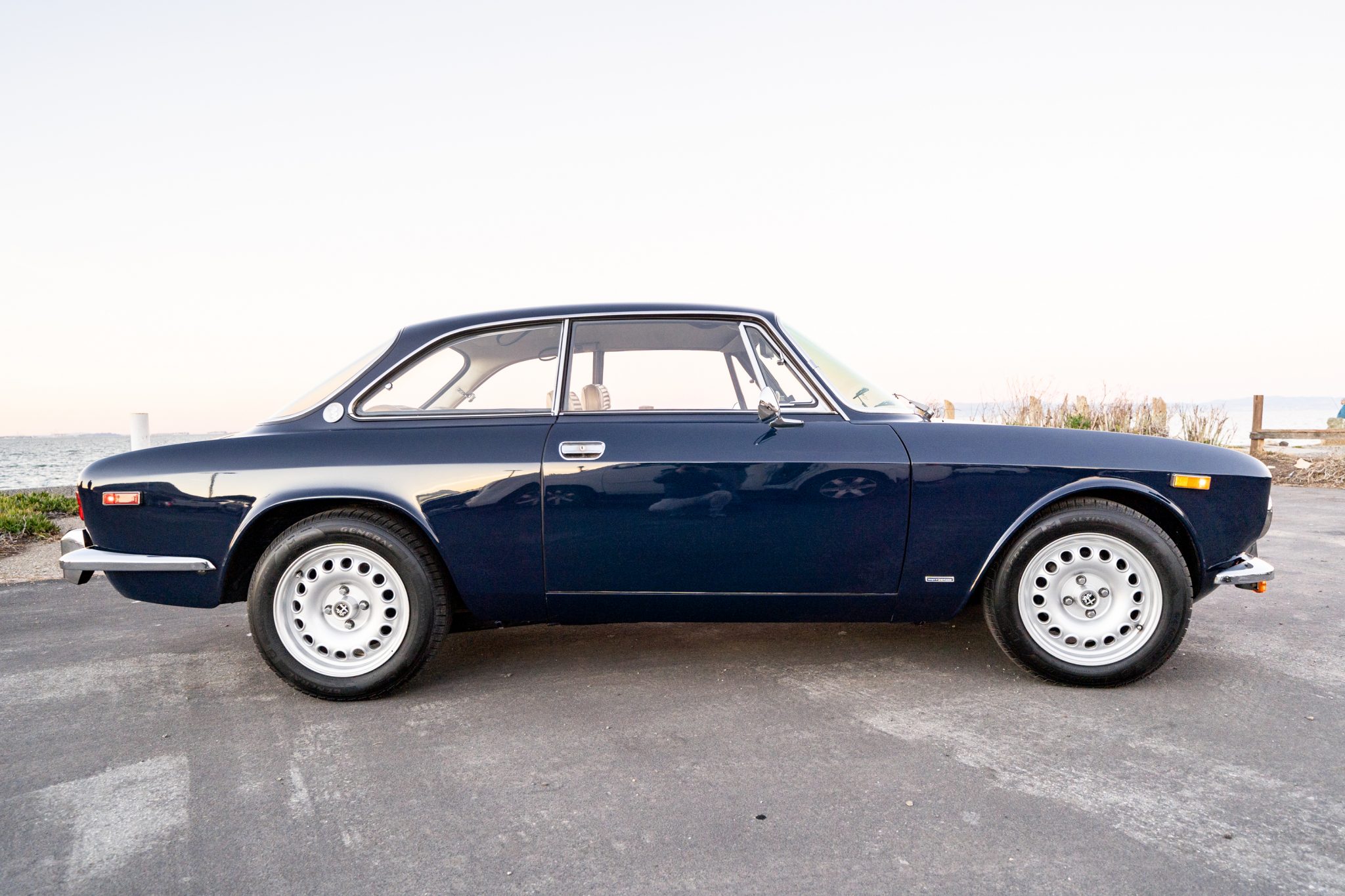 15″ GTA-style wheels feature Alfa Romeo center caps and are fitted with 195/60 General AltiMAX RT43 tires at each corner. A spare tire is mounted in the trunk. The seller notes that service during current ownership included rebuilding the brake calipers and replacing the brake fluid.