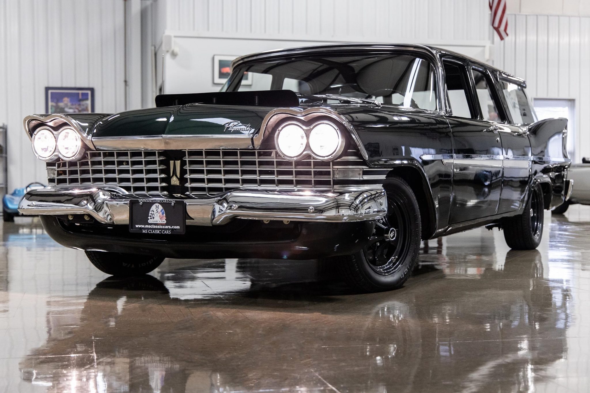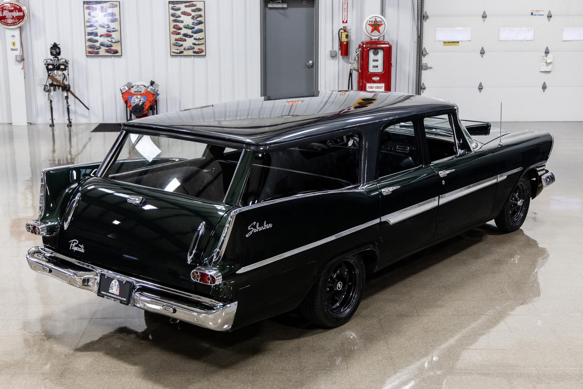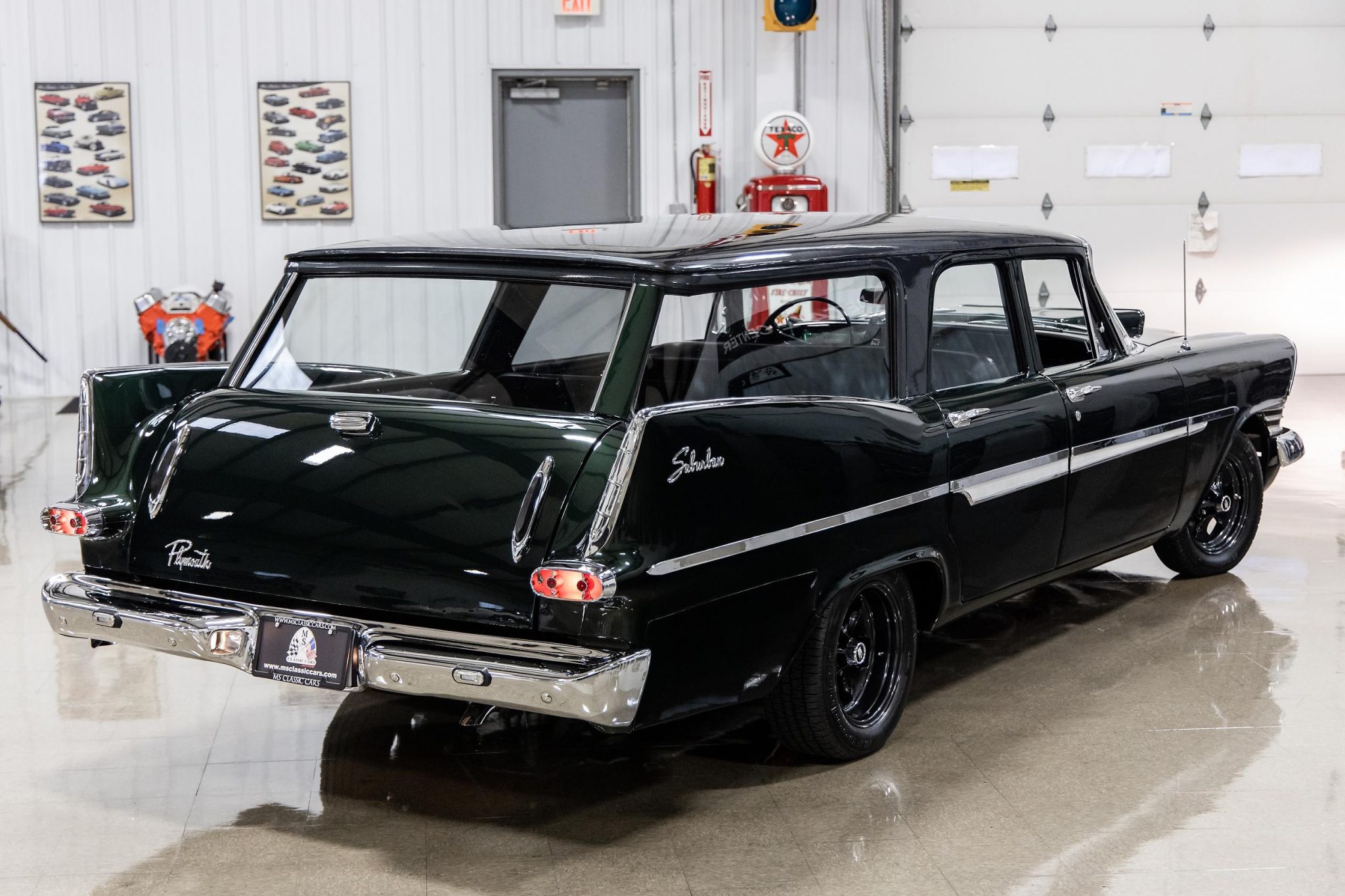 Reproduction side moldings were fabricated to replicate the factory pieces unique to 1959 Suburbans. The split egg-crate grille, also distinct to the model year, was refurbished along with the bumpers and additional brightwork. Staggered black 15” Keystone wheels are mounted with BFGoodrich Radial T/A tires measuring 155/80 up front and 205/60 at the rear. The braking system was updated with Scarebird Classic front discs and a Wilwood proportioning valve by the previous owner, while the brake master cylinder, left front caliper, and fluid were replaced by the selling dealer.