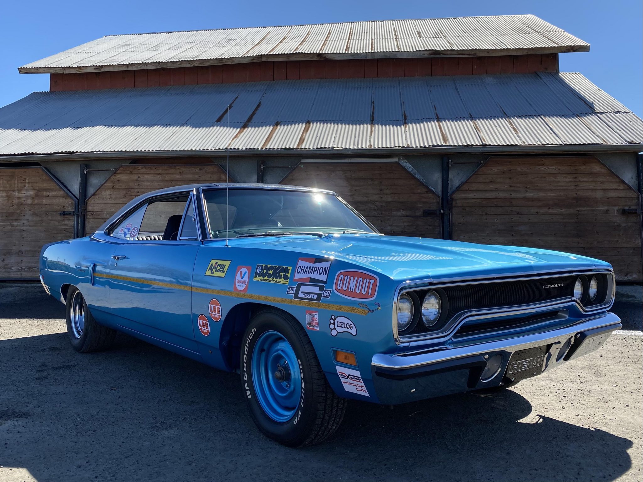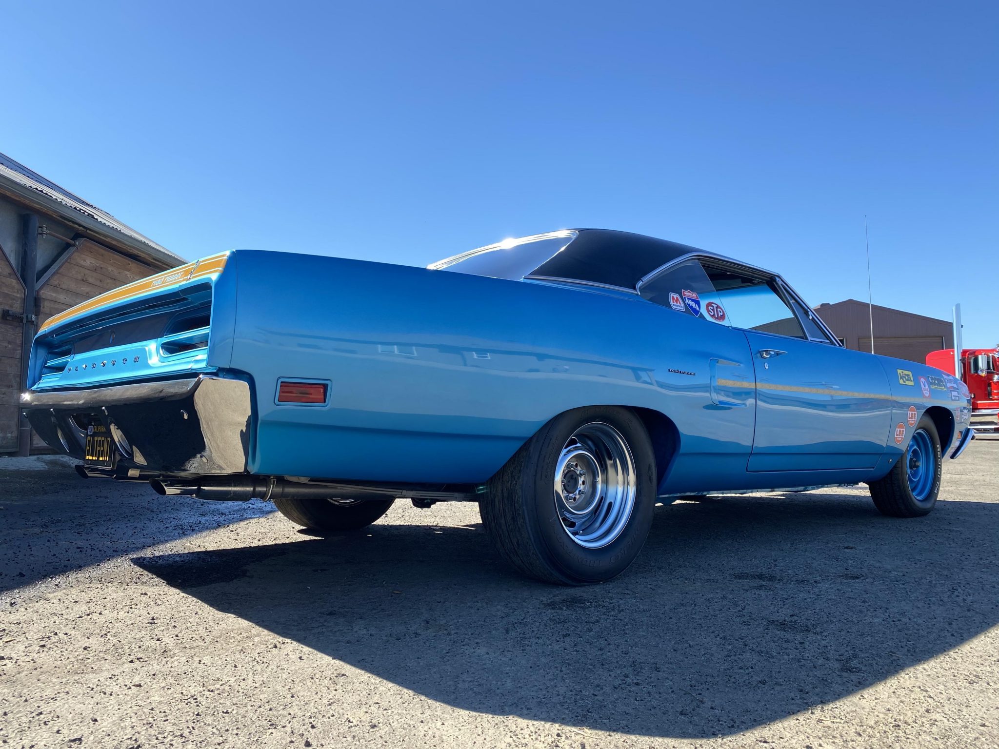 Body-color 15″ steel front wheels wear BFGoodrich Radial T/A tires, while the chrome rear units wear Mickey Thompson ET Street R tires. A full-size spare wheel with older rubber is mounted in the trunk, and a set of factory-style steel wheels and hubcaps are included in the sale. Braking is handled by front discs and rear drums.