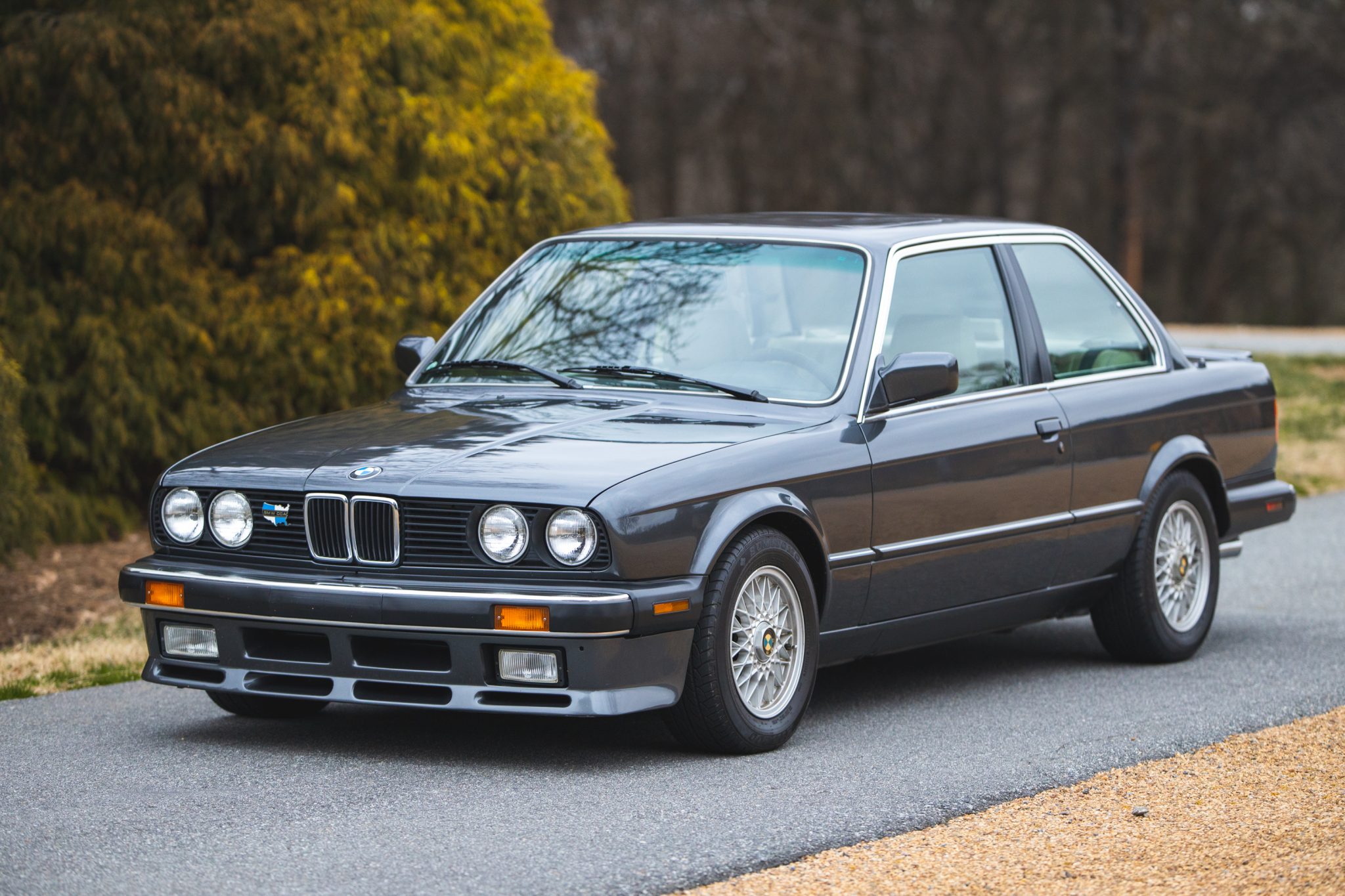 Silver 14″ basketweave wheels wear BMW-roundel center caps and are mounted with Sumitomo HTR 200 tires showing 2004 date codes. Bilstein Sport shocks and H&R lowering springs are fitted, and braking is handled by discs at all four corners.