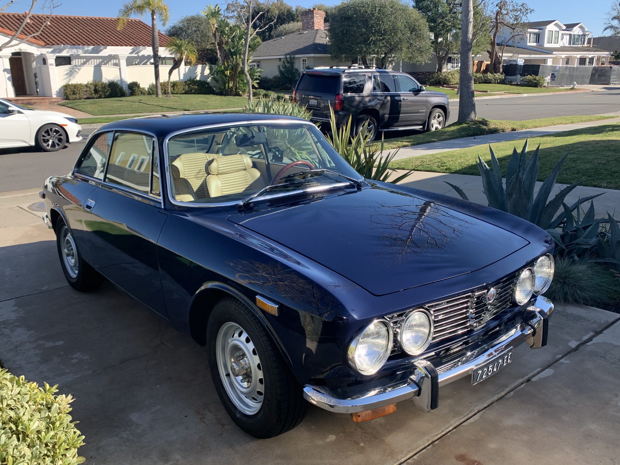Steel 14″ wheels with Alfa Romeo center caps wear Yokohama tires that were mounted in August 2016. Braking is provided by power-assisted four-wheel discs. The front suspension was disassembled, powdercoated, and rebuilt with new bushings and ball joints by A & A Import Service of Santa Barbara, California, in March 2016.
