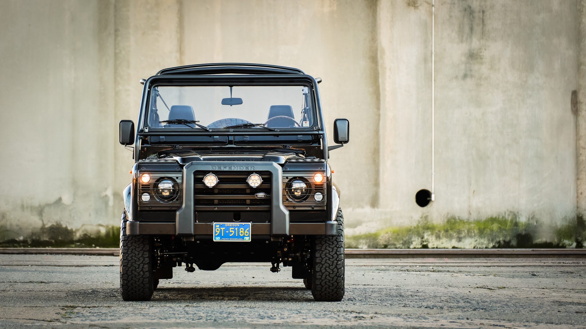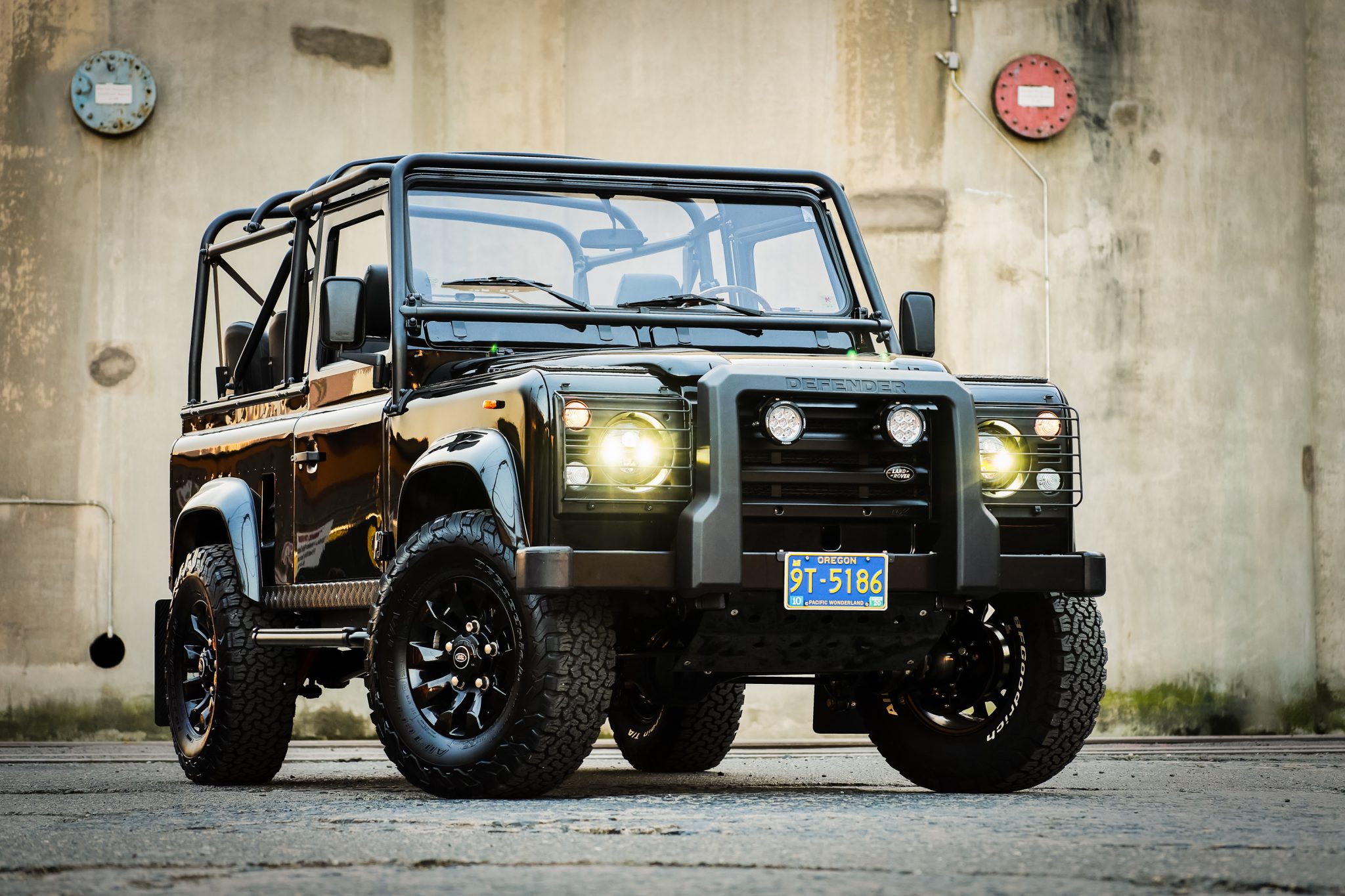 The custom black soft top features plastic side and rear windows and can be seen up close in the gallery. Black-finished 18″ Land Rover Sawtooth wheels are mounted with BFGoodrich All-Terrain T/A tires, with a matching spare mounted on a swing-away carrier out back. The suspension was lifted 1.5″ during the refurbishment, and Koni red shocks were fitted along with stainless steel fuel and brake lines. Stopping power is provided by front discs and rear drums.