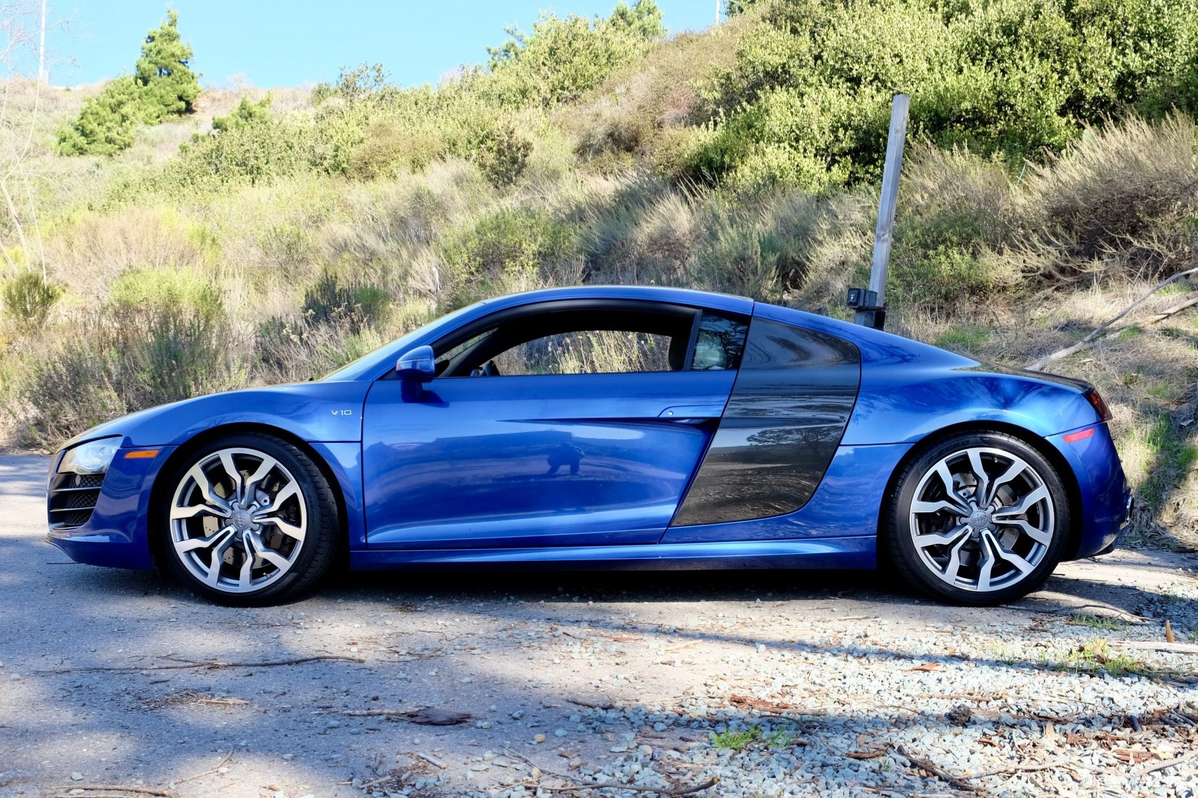 Factory 19″ forged Y-spoke wheels are mounted with Pirelli P Zero tires measuring 235/35 front and 295/30 rear that were installed in July 2019. The eight- and four-piston brake calipers are finished in black with white R8 script and are paired with cross-drilled rotors at each corner.