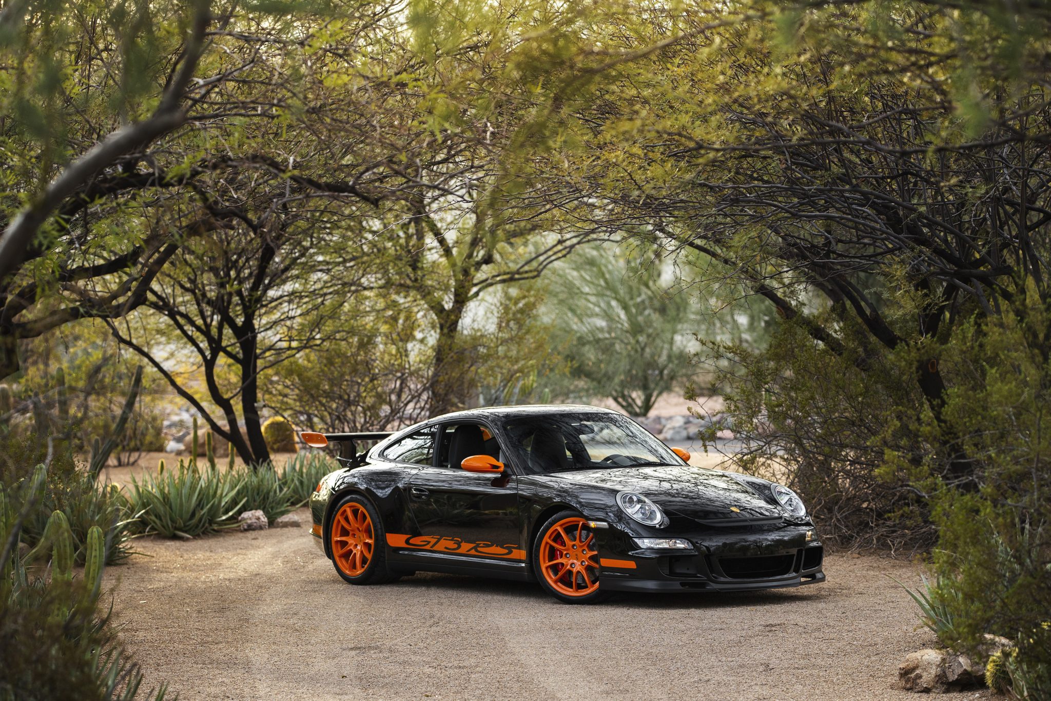 Orange-finished 19″ wheels have RS center caps and are mounted with staggered-width Michelin Pilot Sport Cup 2 tires. Porsche Active Suspension Management was standard equipment, and the disc brakes feature vented and cross-drilled rotors with red-finished calipers.