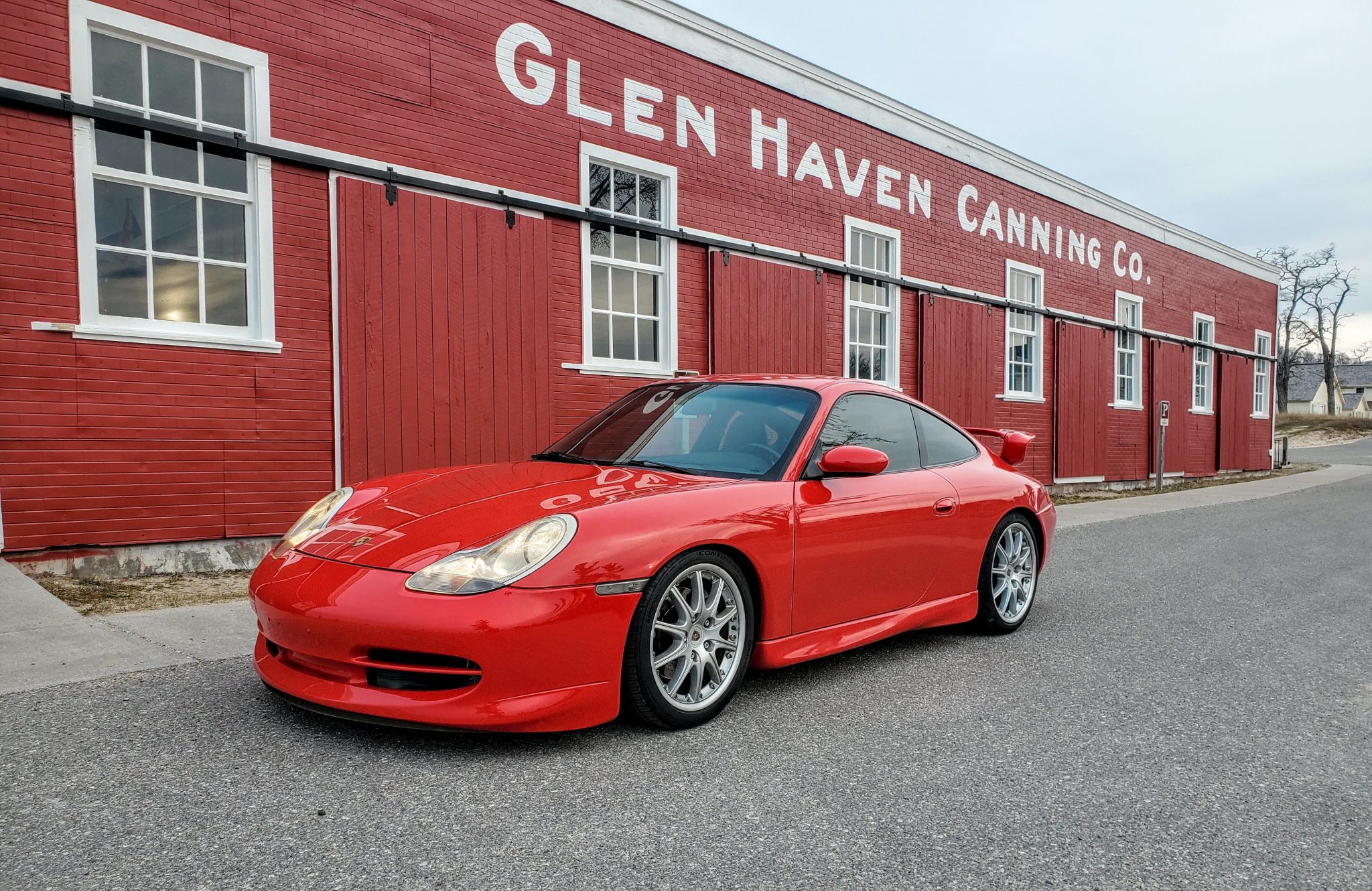 Factory BBS 18″ Porsche Sport Design wheels are mounted with 7mm spacers and are shod in staggered-width Continental ExtremeContact tires. The car has been lowered using Ceika coilovers. The seller notes a scuff on one of the rear wheels, and the removed suspension components accompany the car.