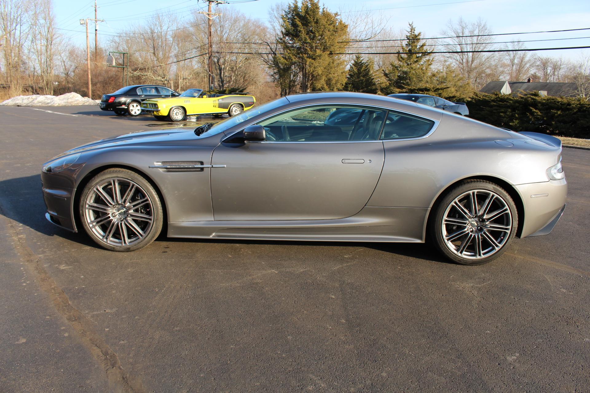 Split-spoke 20″ wheels are finished in Graphite Grey and mounted with Pirelli P-Zero tires showing 2017 date codes. Black Aston Martin brake calipers are paired with cross-drilled carbon ceramic rotors at each corner, and the selling dealer states that a brake fluid flush was conducted in preparation for the sale.