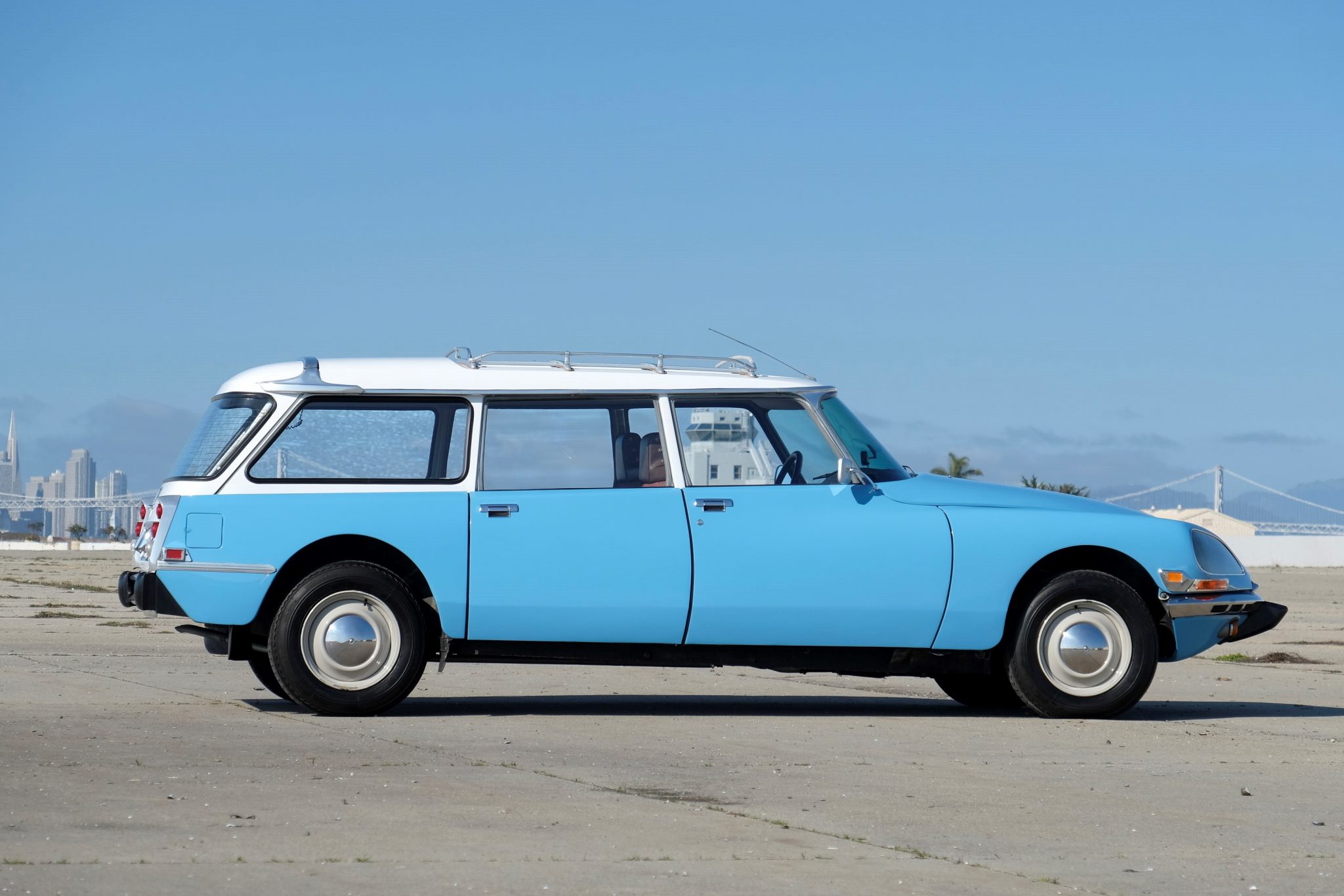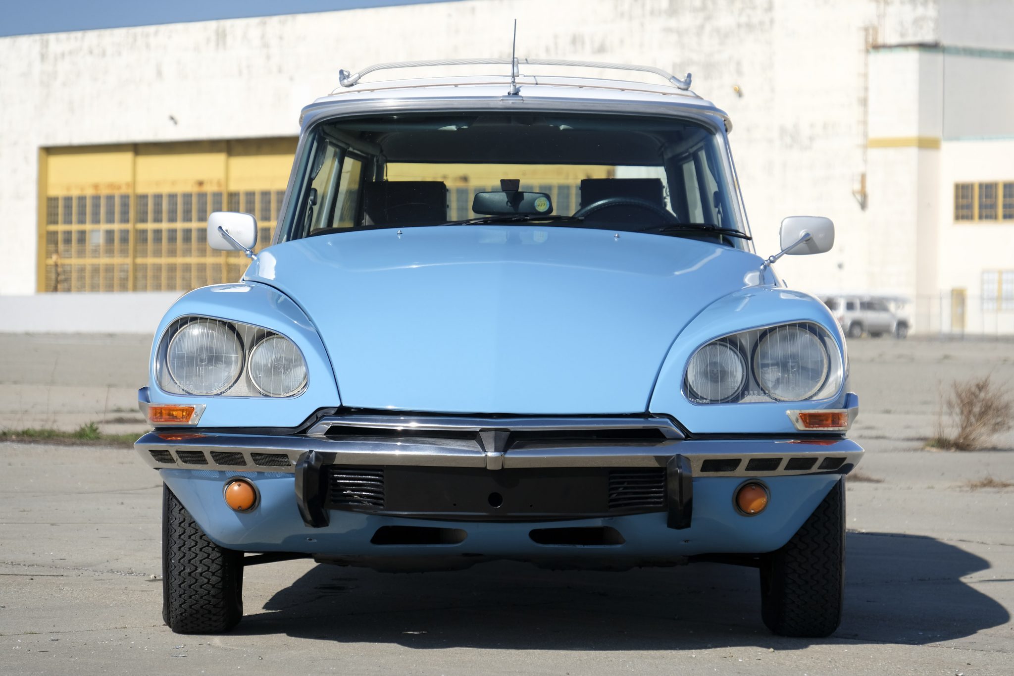 Painted 15″ steel wheels wear full chrome covers on the left side and center caps on the right, and they are mounted with Michelin XAS radial tires that were installed in 2014. A five-cylinder hydraulic suspension pump was also installed, and the steering rack was rebuilt. Equipment includes a self-leveling hydropneumatic suspension, power steering, and power-assisted brakes with inboard-mounted front discs and rear drums. A leak is noted from one of the left front suspension spheres.