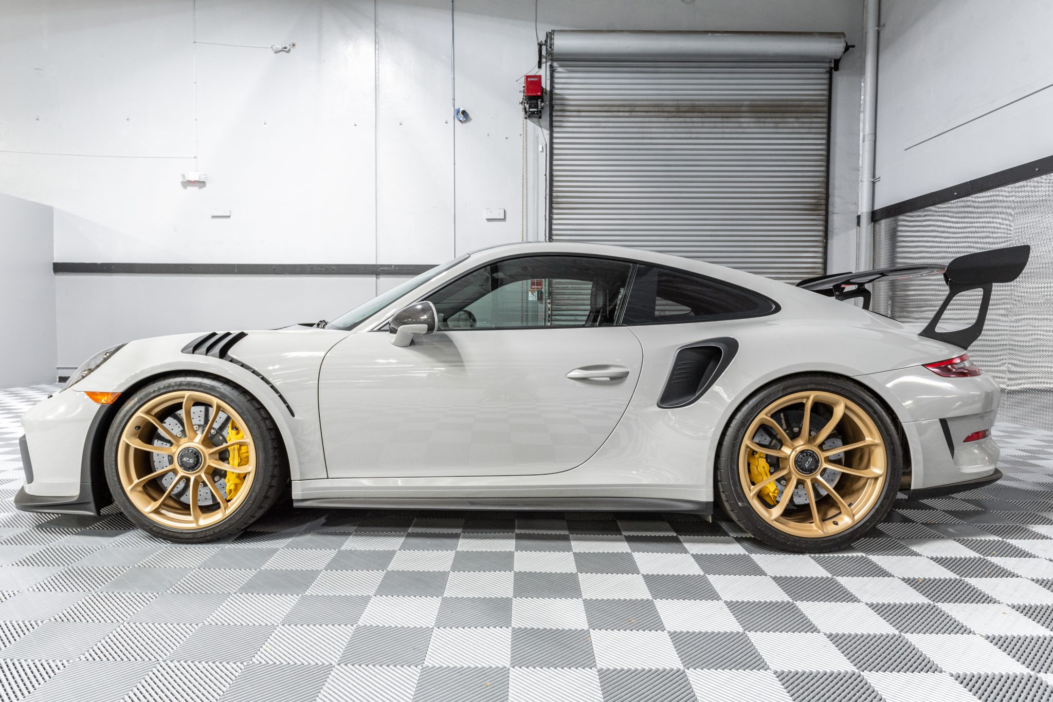 Factory 20″ front and 21″ rear center-lock wheels are finished in satin gold and wear Dunlop Sport Maxx Race 2 tires measuring 265/35 up front and 325/30 out back. The Weissach Package specified stiffer carbon composite anti-roll bars, and this example is optioned with Porsche Ceramic Composite brakes with yellow calipers as well as the front-axle lift system.